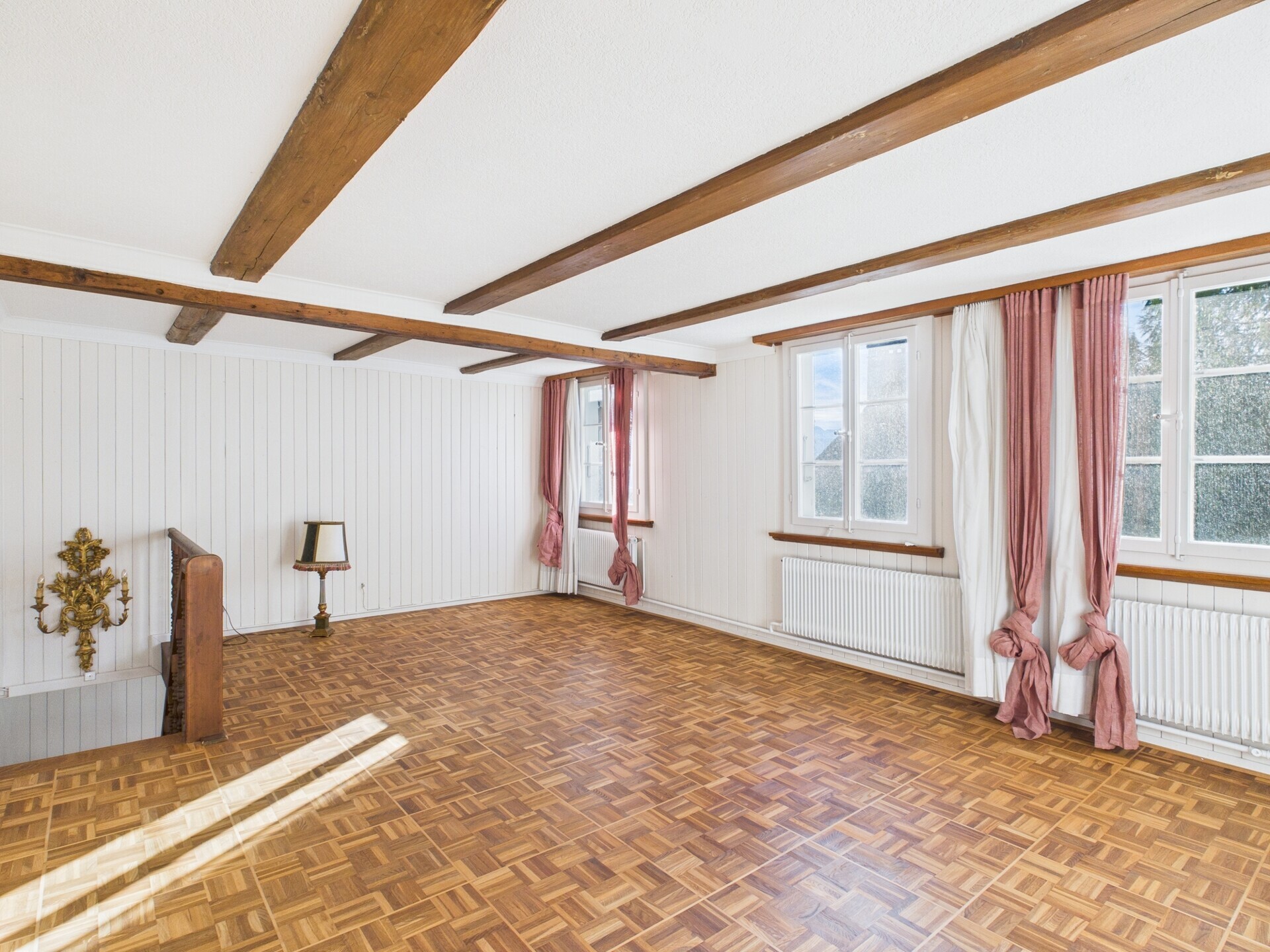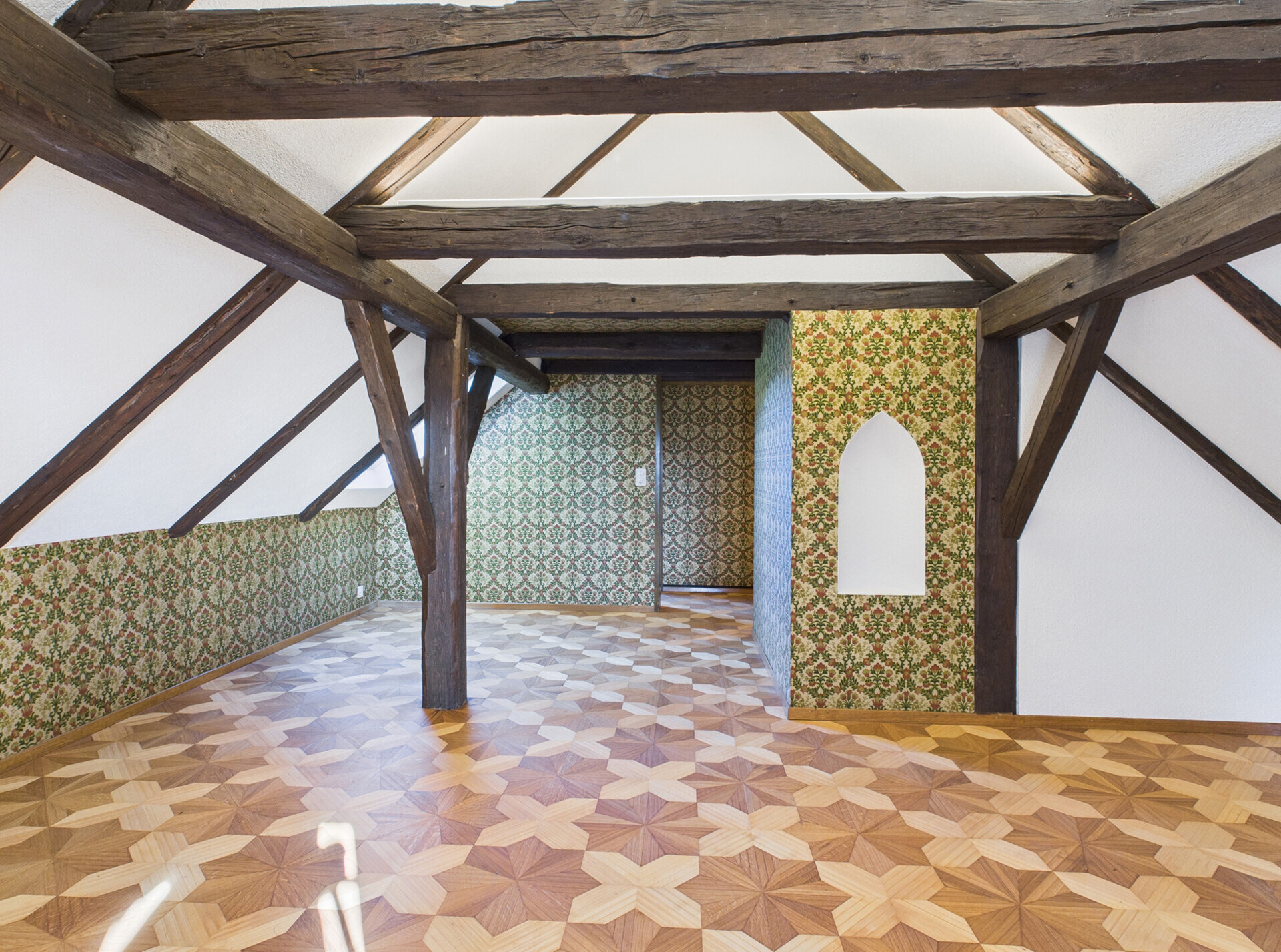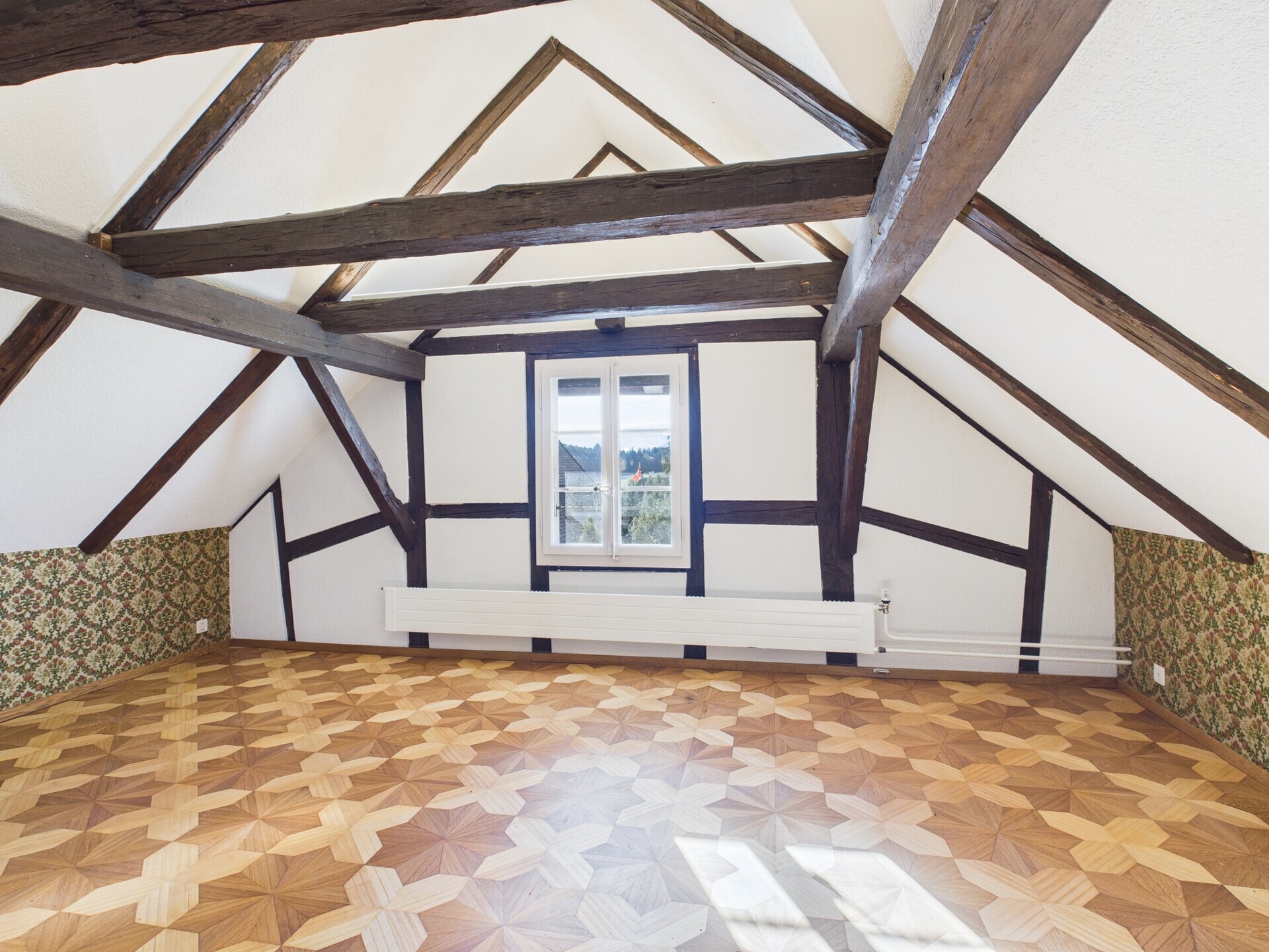 Im Dachgeschoss erwartet Sie ein grosszügiges Zimmer mit offener Raumhöhe bis unter den Giebel – ideal als Schlafzimmer, Atelier, Rückzugsort oder Gästebereich. Ergänzt wird die Etage durch einen Nassbereich mit Lavabo, Toilette und Sauna sowie eine separate Dusche.