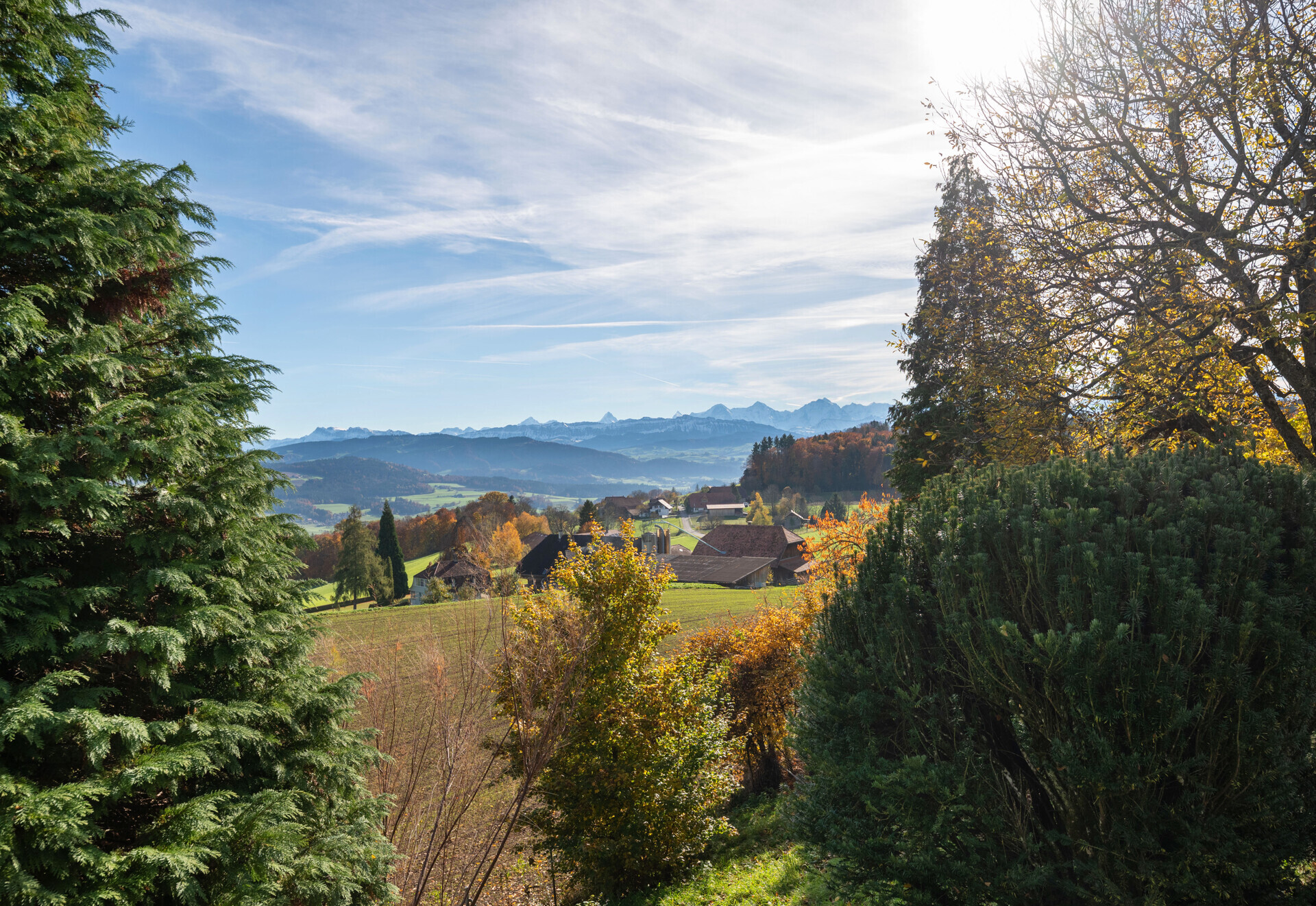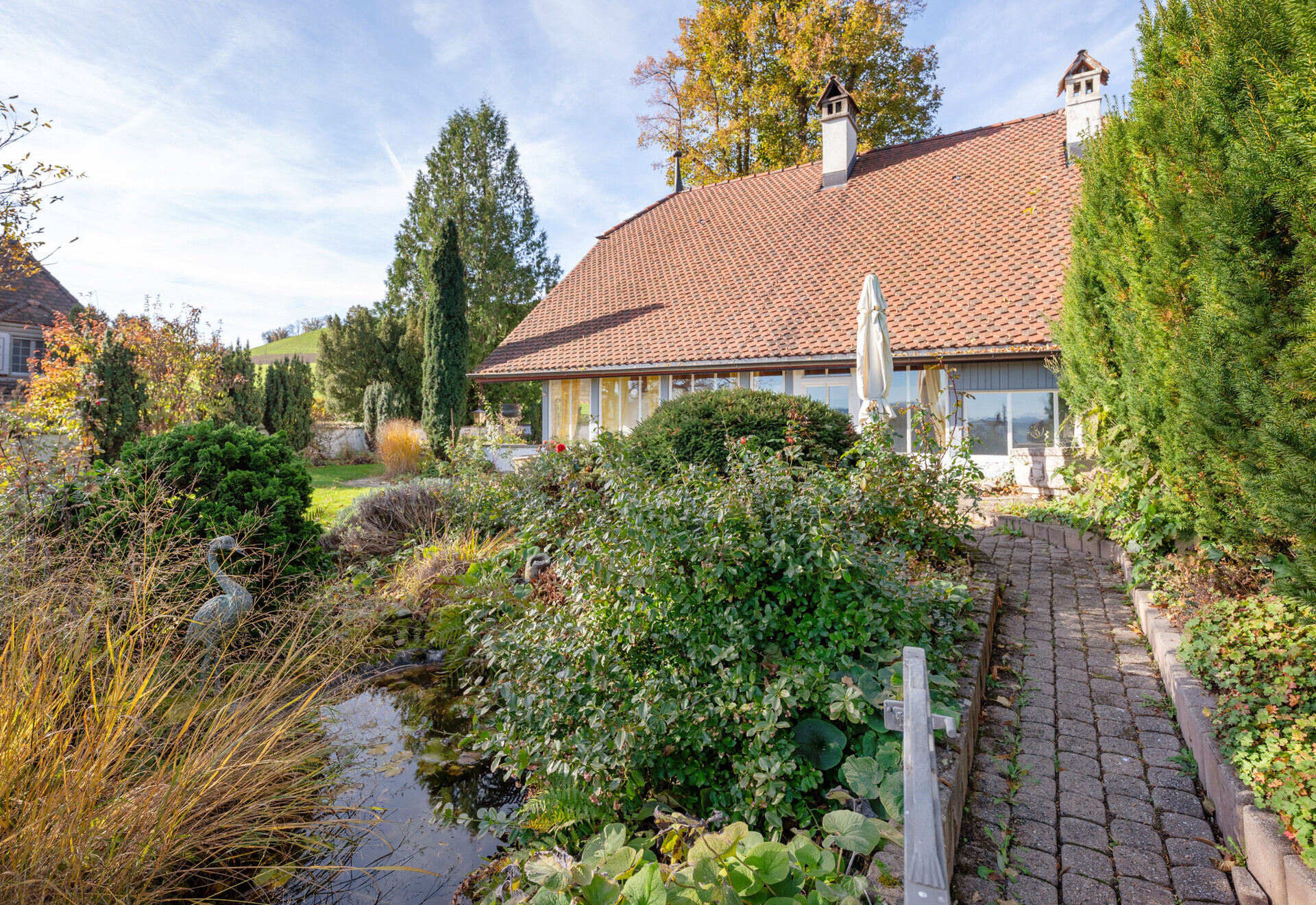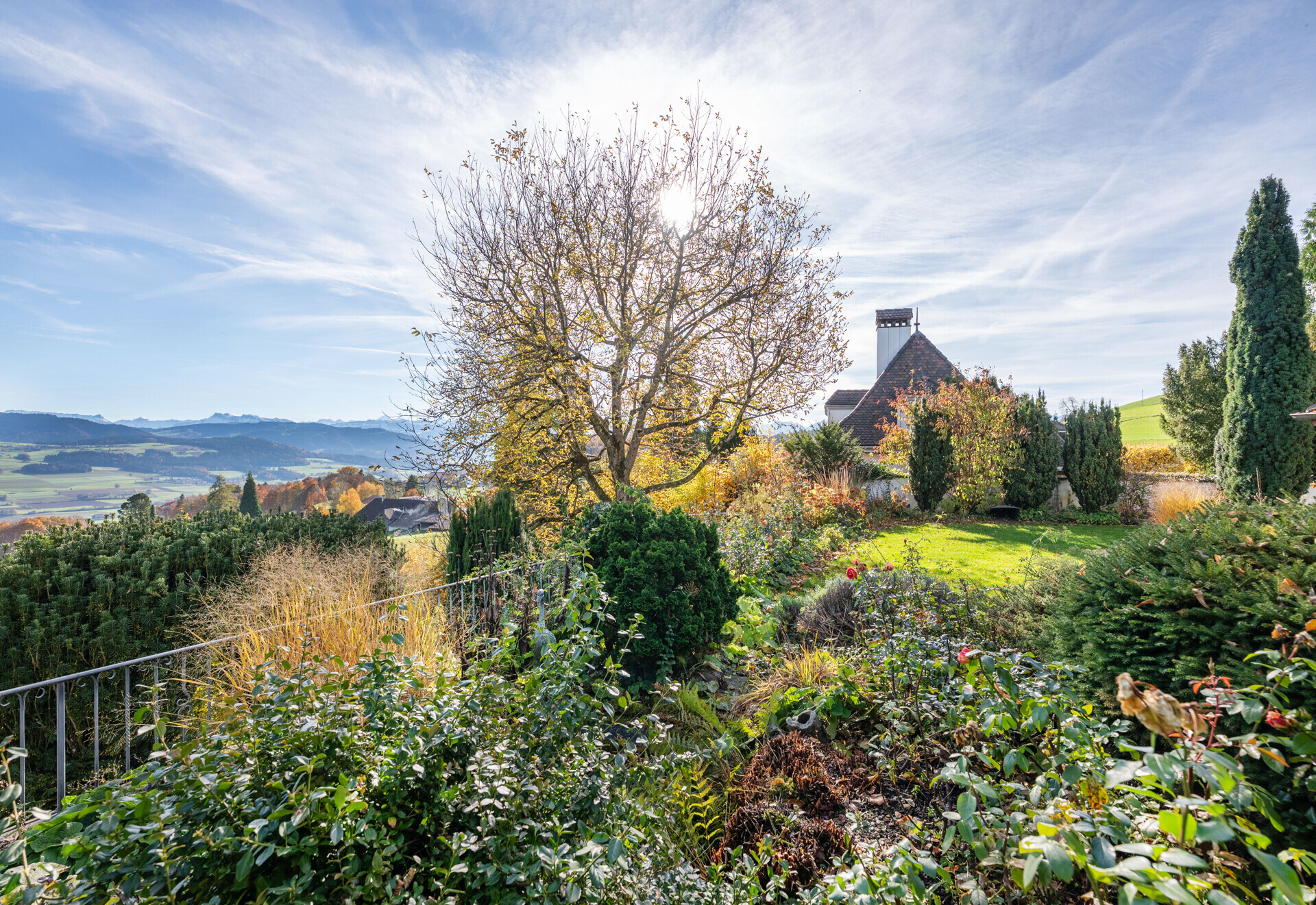 Die Liegenschaft ist von einer liebevoll gepflegten Gartenanlage umgeben und bietet attraktive Sitzplätze, ein Biotop, einen Brunnen, zwei Gartenhäuser, grosszügigen Landanteil sowie zahlreiche Bäume, die für Privatsphäre und eine naturnahe Atmosphäre sorgen. Das Highlight: Eine unverbaubare Panoramasicht über das Aaretal bis in die imposanten Berner Alpen.