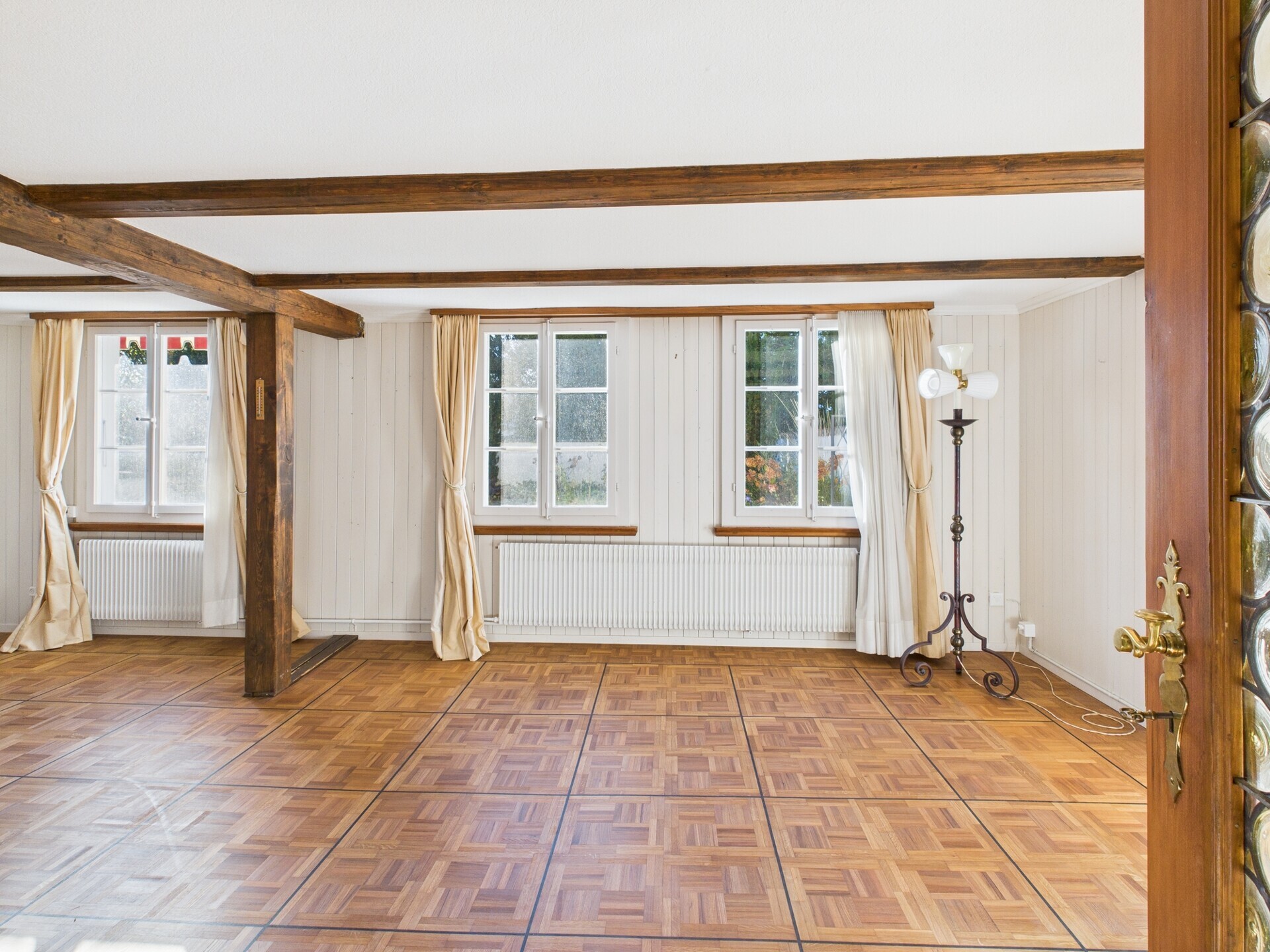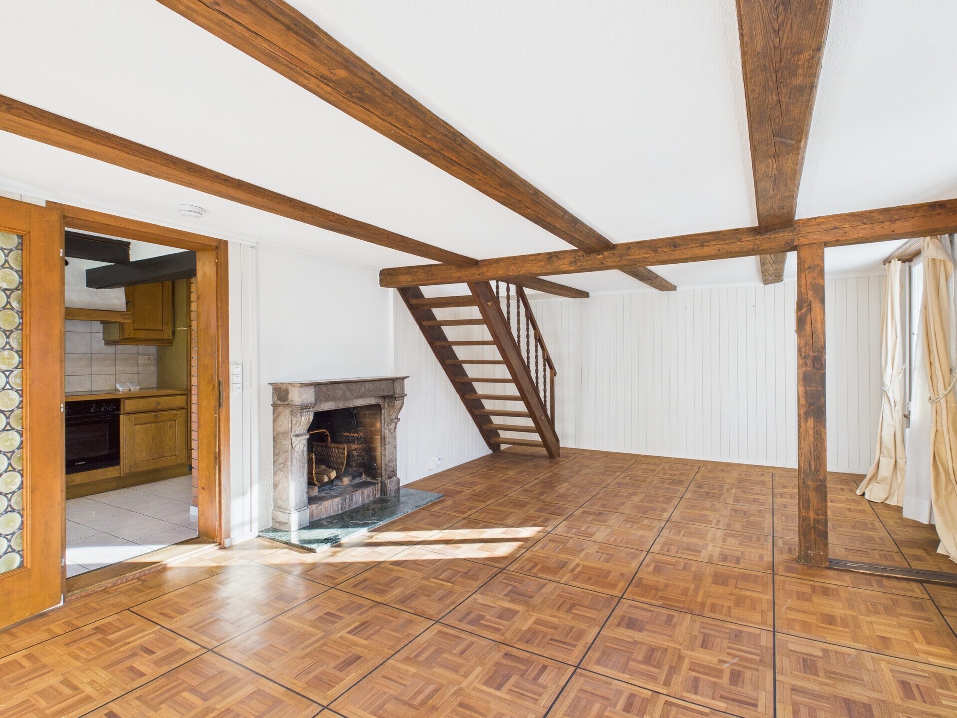 Der Zugang zur Liegenschaft erfolgt durch ein schmiedeeisernes Gittertor, das direkt in den üppig begrünten Garten führt. Eine helle Eingangshalle mit doppelter Raumhöhe und vielen Fenstern heisst Sie willkommen. Von hier aus gelangen Sie in die geschlossene Küche, in den ehemaligen Stall oder über eine Holztreppe ins Obergeschoss. An die Küche grenzt das stilvolle Wohn- und Esszimmer mit Cheminée. Auch im Innenbereich zeigt sich der traditionelle Riegbaustil eindrücklich, insbesondere durch die sichtbaren Deckenbalken. Vom Wohnbereich führt eine Treppe direkt in ein Schlafzimmer im Obergeschoss. Neben der Küche befindet sich der Technikraum mit Toilette, Lavabo und Waschmaschine. Ein nordseitiger Raum (ehemaliger Stall) mit rund 26 m² bietet vielseitiges Potenzial – etwa als neuer Technikraum, Hobbyraum oder direkter Hauseingang vom Carport.Das Obergeschoss umfasst ein Zimmer mit Treppe zum Wohnbereich sowie ein Badezimmer. Ein zentraler Vorplatz (könnte z.B. auch als Ankleide etc. genutzt werden) erschliesst die Galerie mit einen kleinen Abstellraum und Zugang zum Dachgeschoss.