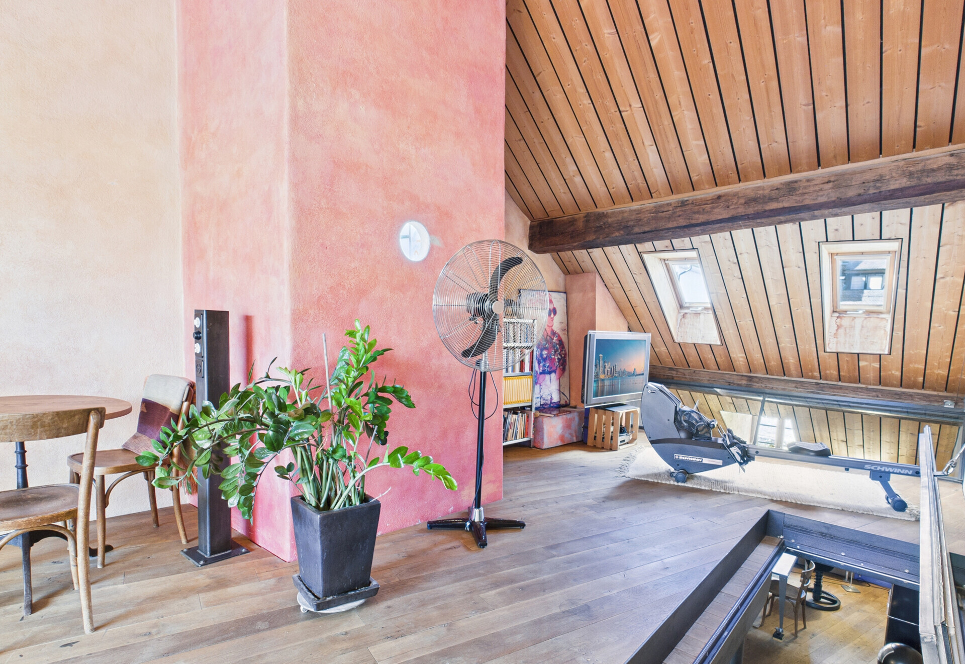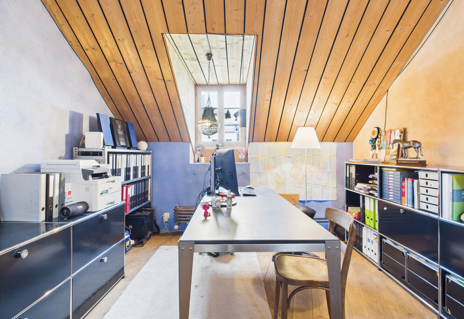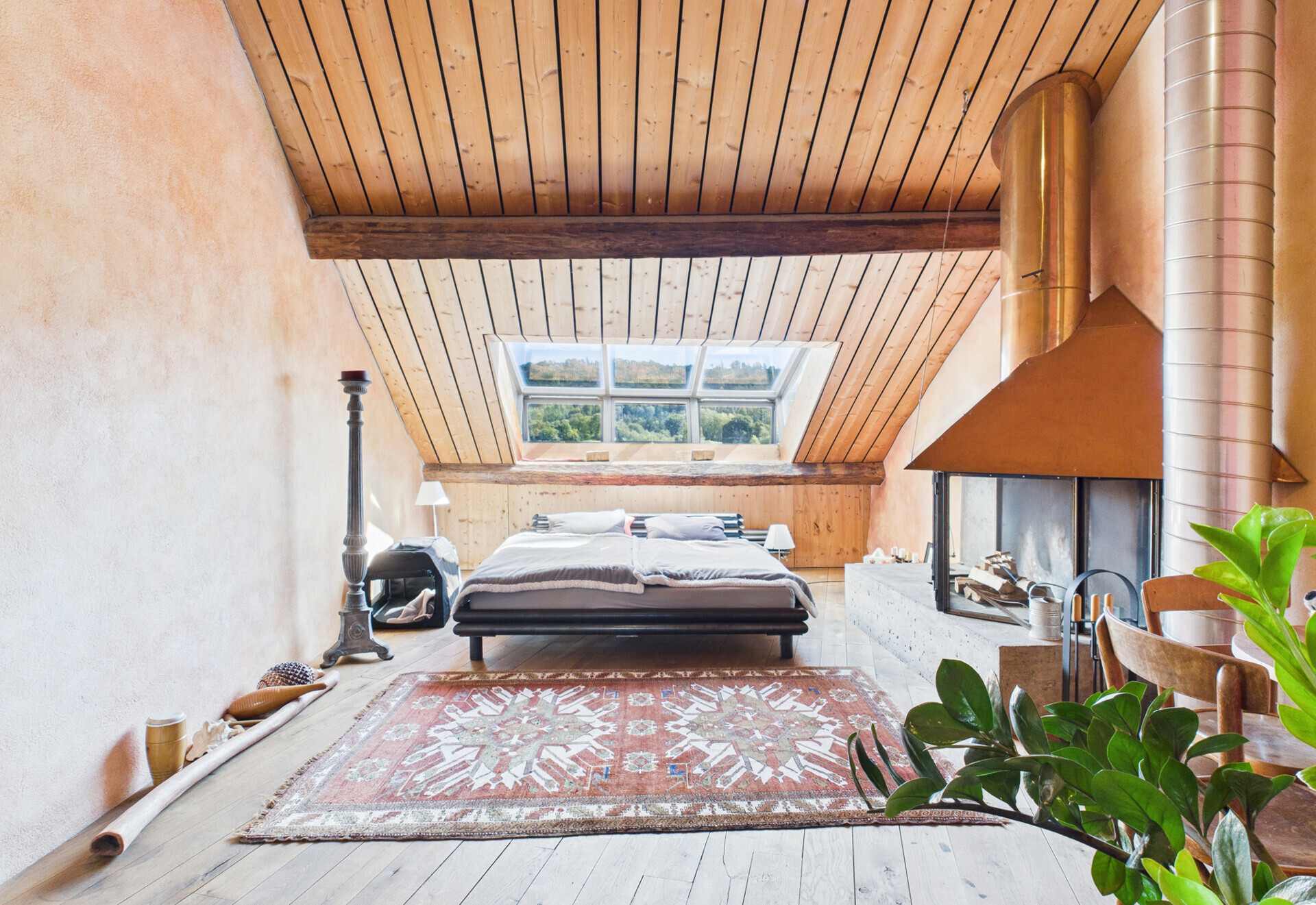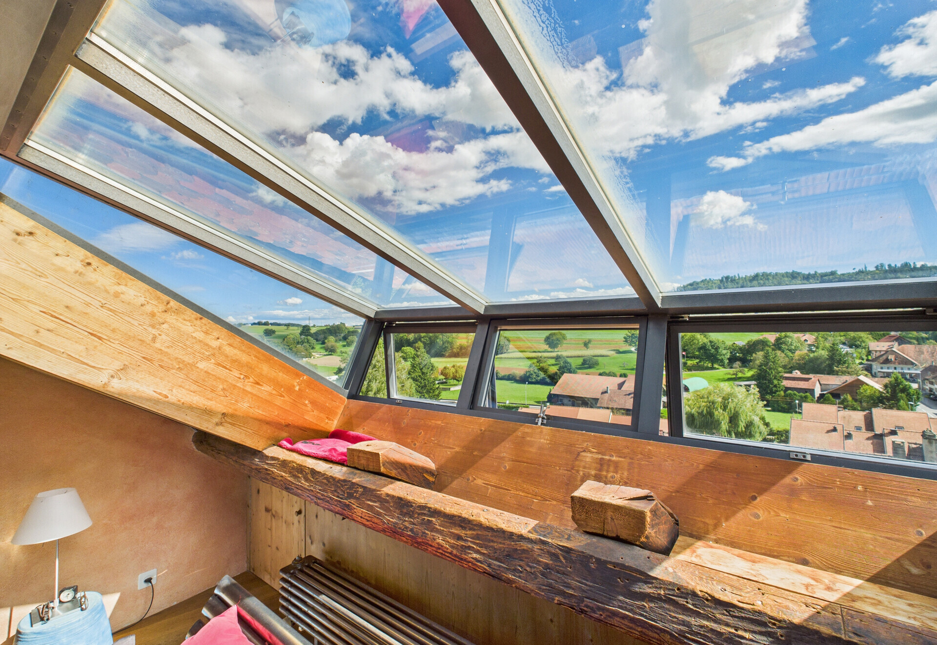 Über ein weiteres Zwischengeschoss mit charmanter Dachschräge, welches als weiterer Raum genutzt werden kann, erreicht man den obersten Wohnbereich. Dieser überzeugt nicht nur durch seine Gemütlichkeit, sondern auch durch ein Cheminée, das an kalten Tagen für eine besonders behagliche Stimmung sorgt. Ein grosses Dachfenster eröffnet hier zudem einen spektakulären Blick auf die umliegenden Wiesen, Wälder, Felder und Berge. Warme Farben und die hölzerne Dachschräge runden die einladende Atmosphäre ab. Eine automatische, gläserne Falltür sorgt dabei für eine moderne und praktische Raumtrennung.