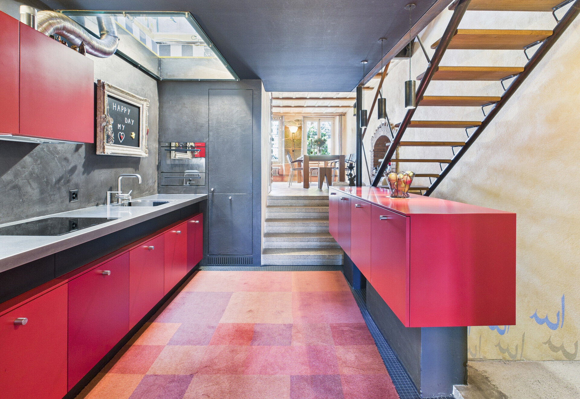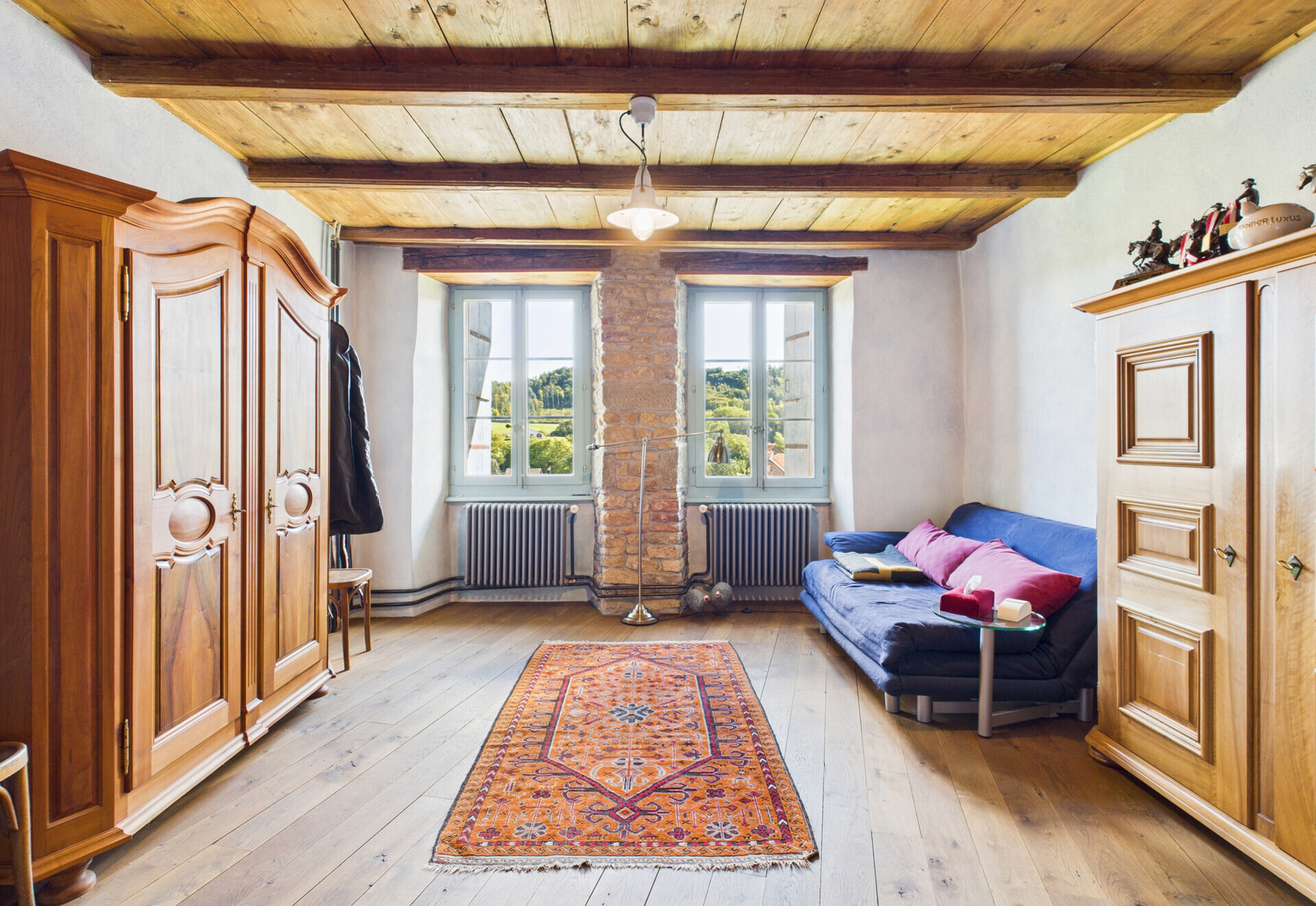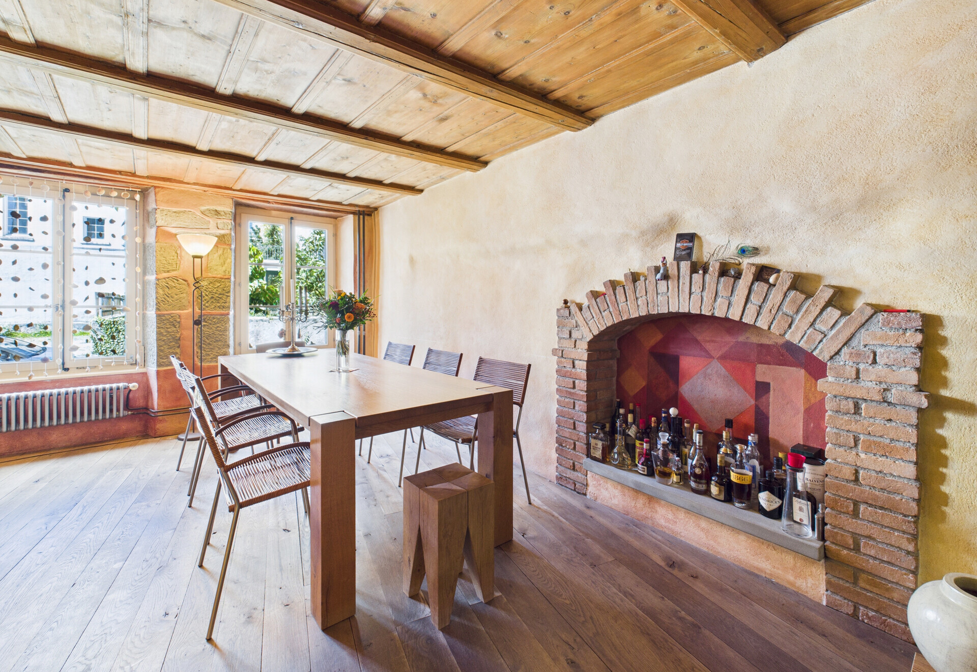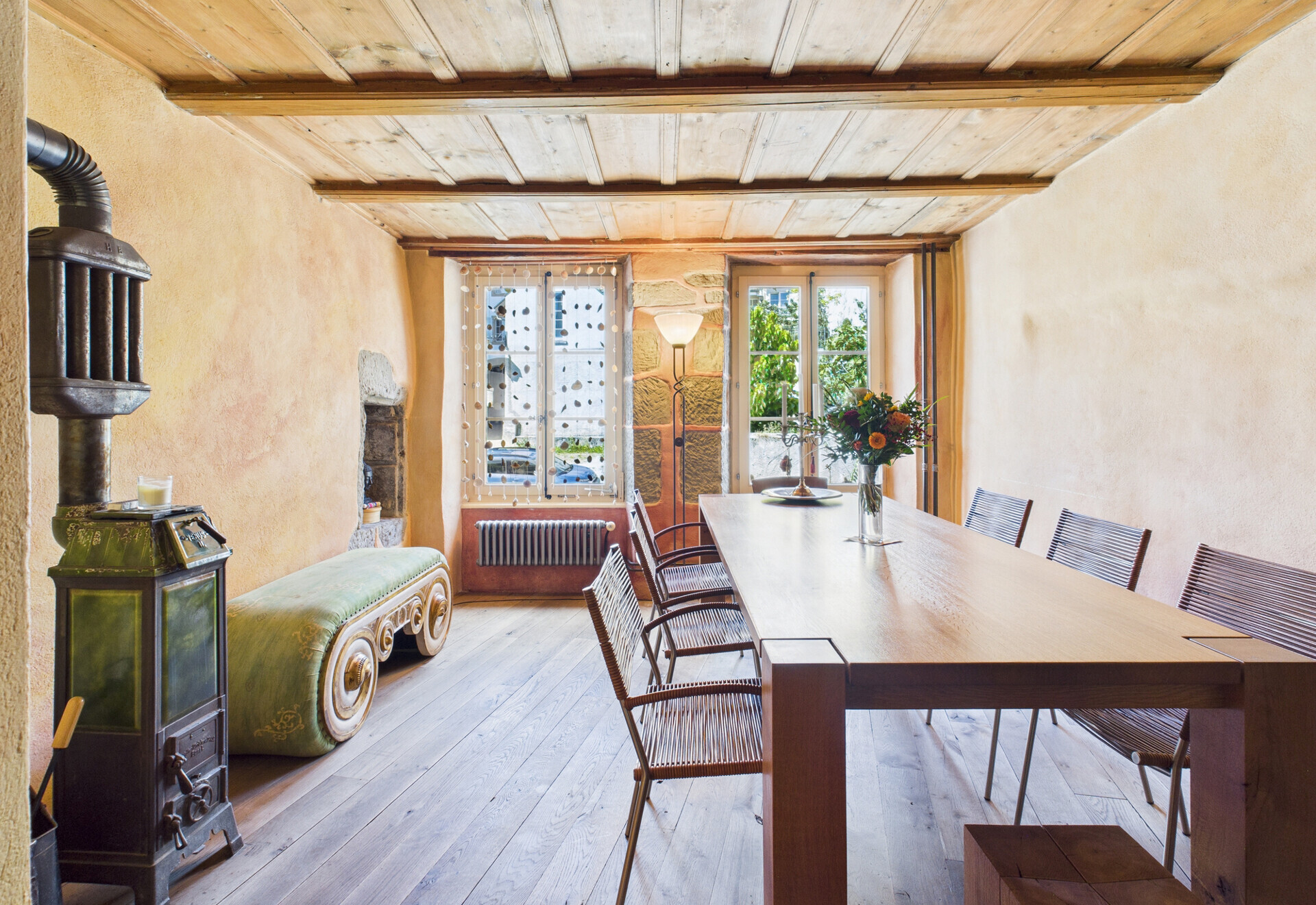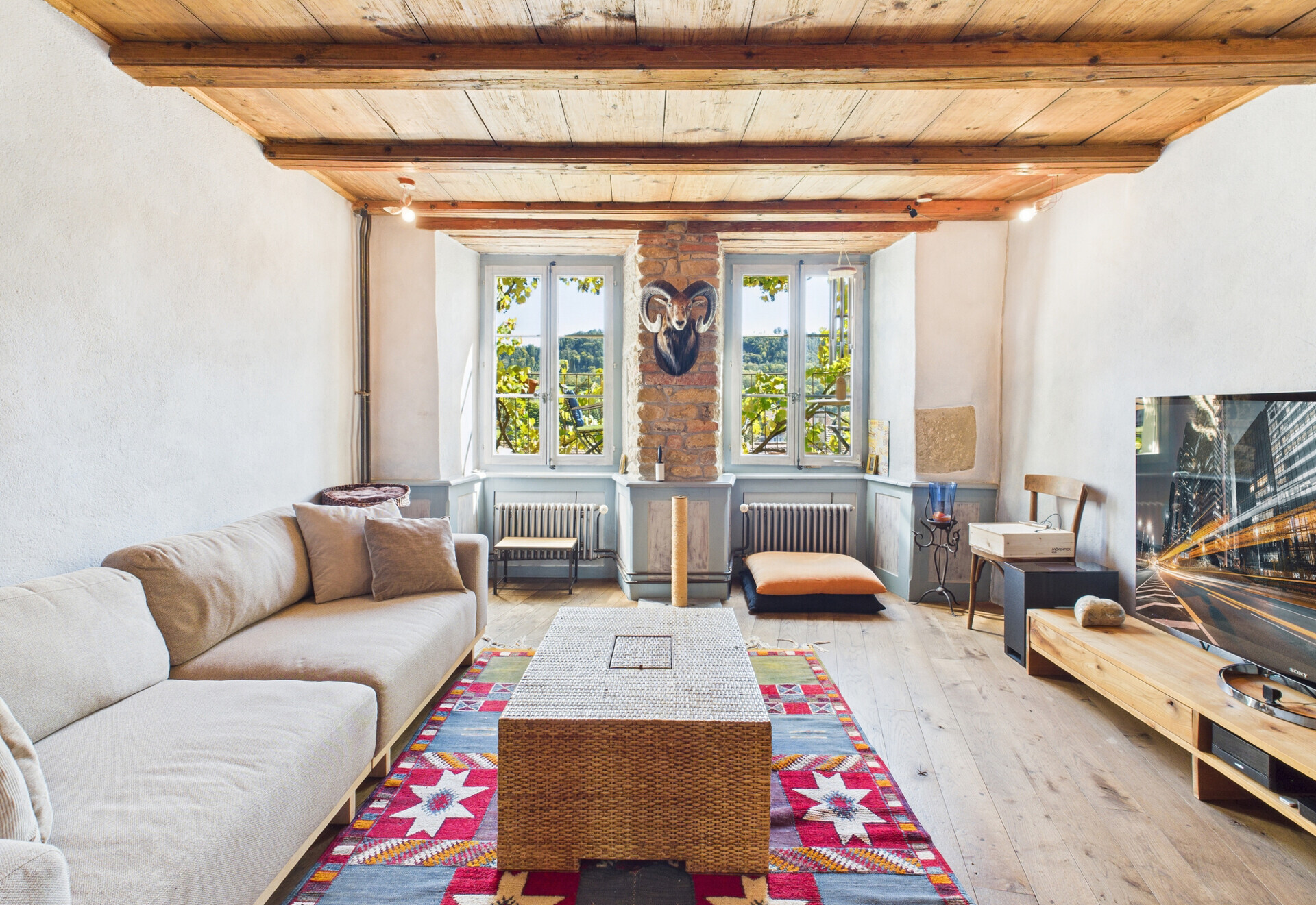 Nach dem Betreten des Hauses führt eine Treppe direkt in den ersten Stock. Dort erwartet Sie eine moderne, rote Küche mit viel Stauraum und einem hochwertigen Kombi-Steamer-Gerät. Angrenzend liegt das gemütliche Wohnzimmer, das mit seiner charakteristischen Holzbalkendecke und dem passenden Boden eine warme Atmosphäre ausstrahlt. Von hier aus gelangen Sie auf einen kleinen, mit Reben umrankten Balkon – ein idyllischer Platz für ruhige Momente. Ebenfalls auf dieser Ebene befindet sich eine separate Toilette. Von der Küche aus, einige Stufen höher, öffnet sich der Essbereich, der durch einen hübschen Kachelofen und eine ebenfalls historische Holzdecke geprägt ist.Weiter führt der Weg über eine Treppe ins nächste Stockwerk, wo sich ein Schlafzimmer sowie die modernen Nasszonen befinden. Dusche und Toilette sind offen eingebaut, können aber bei Bedarf mit einer Schiebetür abgetrennt werden.