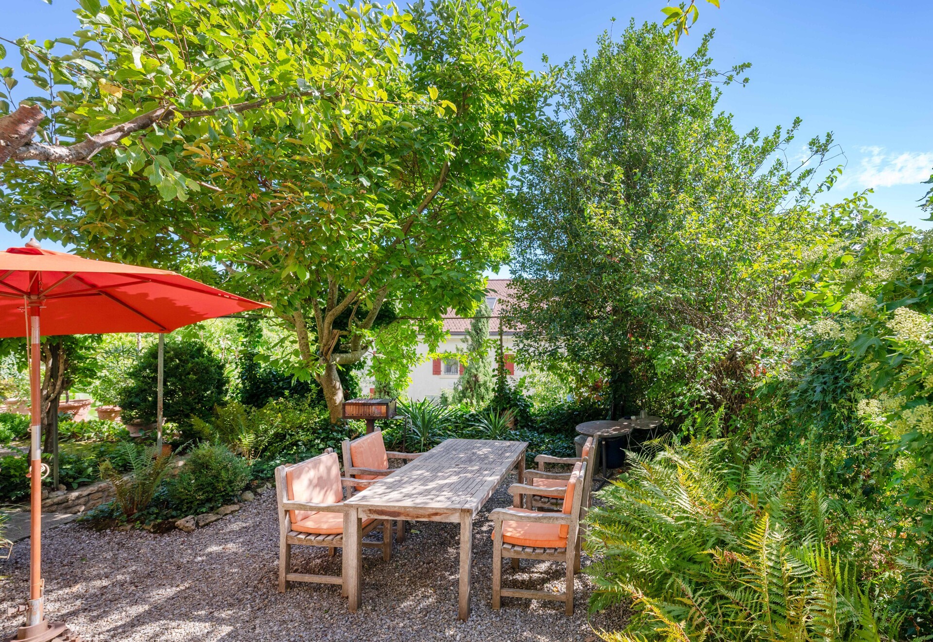 Direkt neben dem Eingangsbereich befindet sich der weitläufige Keller mit drei grosszügigen Räumen. Neben reichlich Stauraum ist hier auch die Waschküche mit Lavabo, Waschmaschine und Tumbler untergebracht. Über den südlichen Ausgang gelangt man vom Keller aus in den liebevoll gestalteten Garten. Zunächst betritt man eine kleine Terrasse, von der eine Treppe zum unteren Gartensitzplatz führt. Dieser ist mit Kieselsteinen ausgelegt, von üppigen Pflanzen umrahmt und bietet eine geschützte, private Atmosphäre – ein idealer Ort, um die Ruhe und Schönheit dieses besonderen Hauses zu geniessen.