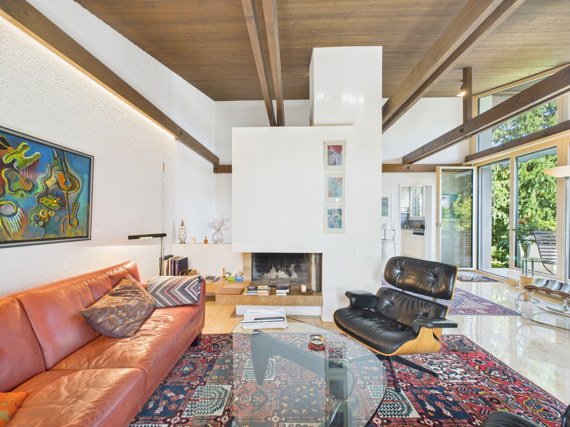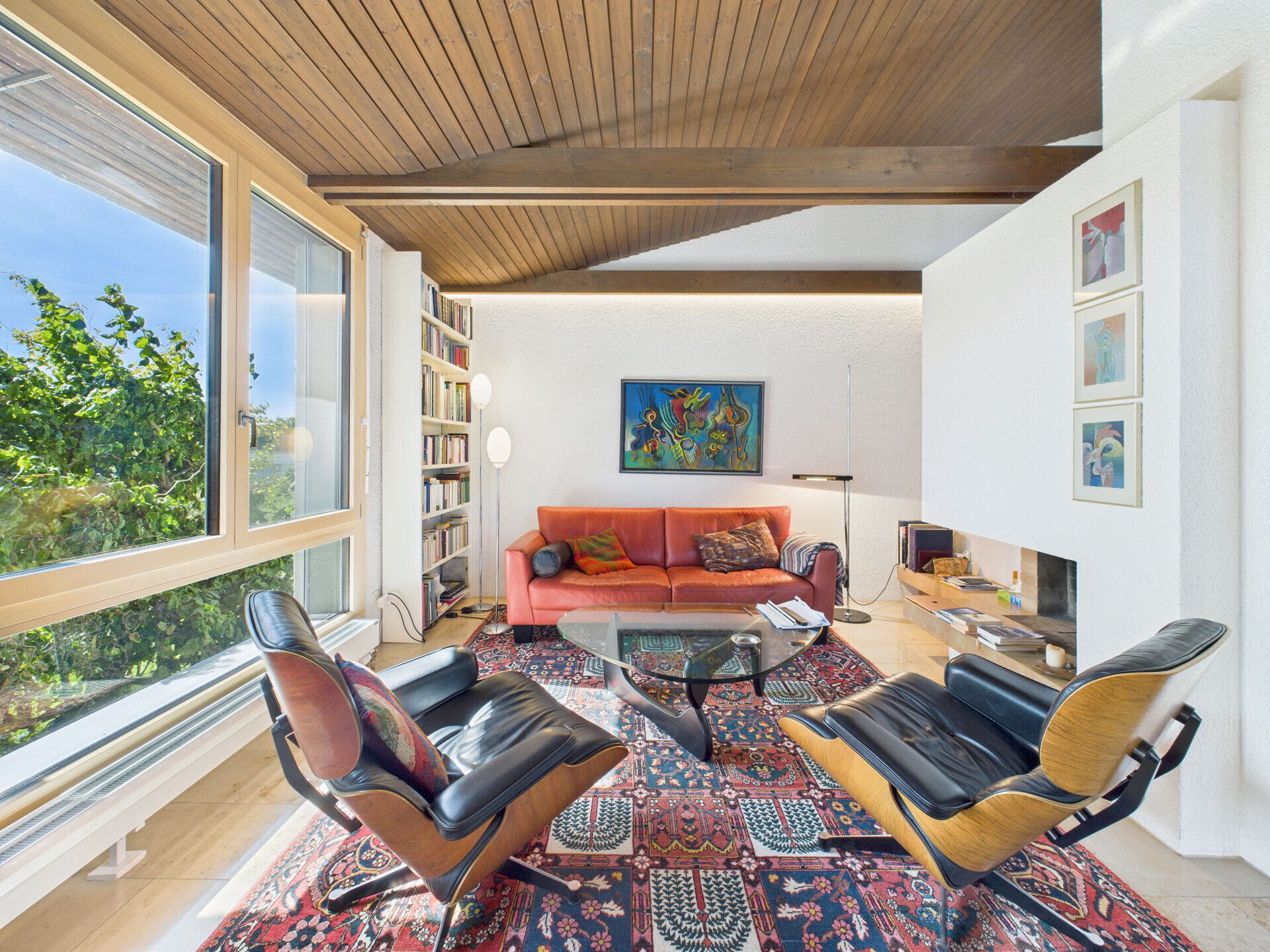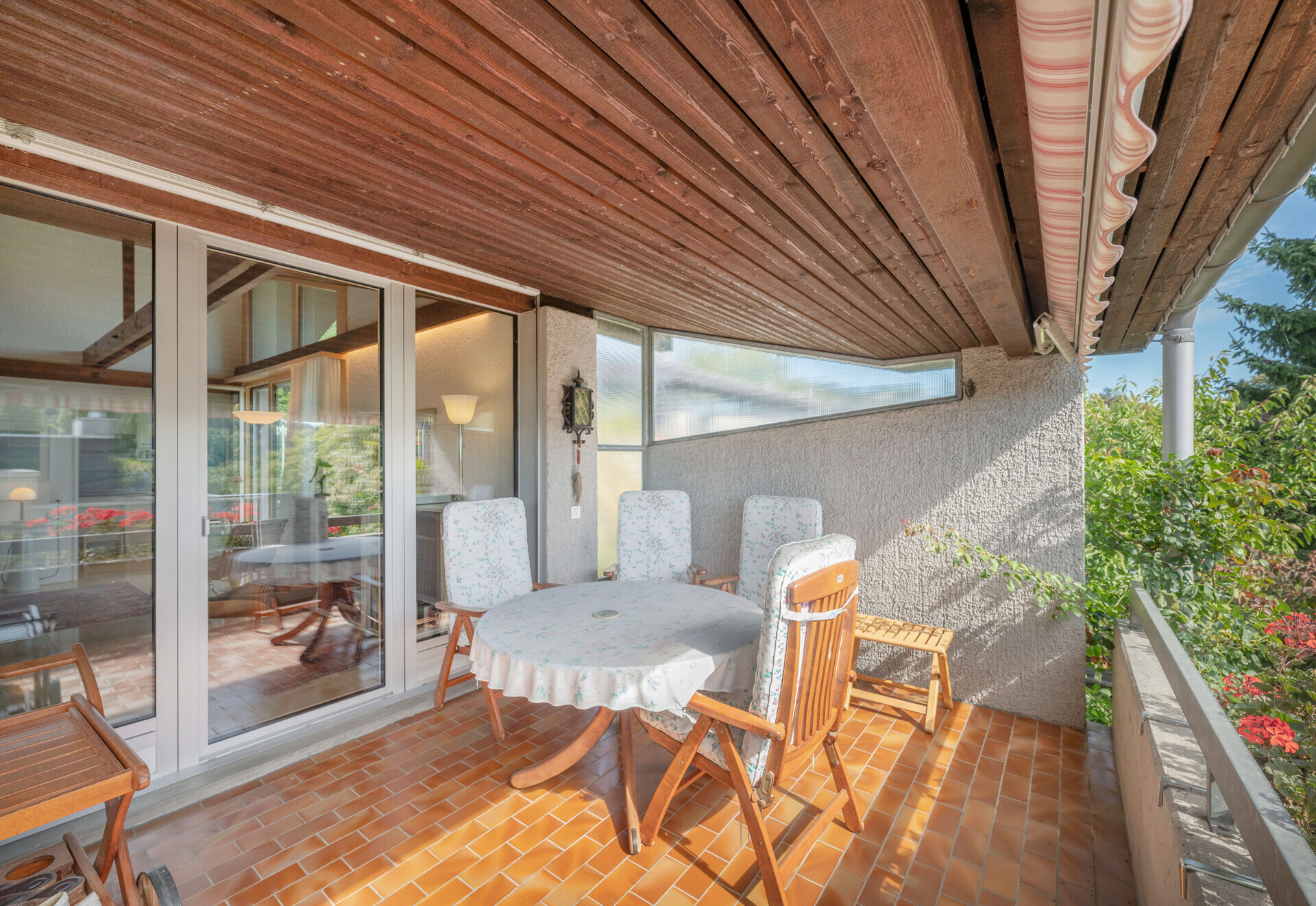 Das Eingangsgeschoss empfängt Sie mit einem freundlichen Entrée mit Garderobe. Zwei helle Zimmer lassen sich vielseitig nutzen, eines davon bietet direkten Zugang in den sonnigen Garten. Ein Bad mit Dusche sowie eine grosszügige Waschküche mit viel Stauraum und Waschbecken runden die Etage ab. Im darunterliegenden Geschoss befinden sich ein klassischer Keller und ein ehemaliger Luftschutzraum, die zusätzlichen Platz schaffen.Das Wohngeschoss im Obergeschoss ist der Mittelpunkt des Hauses. Ein lichtdurchfluteter, offener Wohnbereich mit Cheminée lädt zu gemütlichen Stunden ein. Von hier betreten Sie zwei Balkone, die den Wohnraum nach draussen erweitern. Das angrenzende Zimmer, aktuell als Esszimmer genutzt, verfügt über direkten Zugang zu einem Badezimmer mit Wanne. Die Küche ist abschliessbar, bietet viel Stauraum und erhält durch ihre markante blaue Rückwand eine mediterrane Note. Vom östlichen Balkon gelangen Sie in den hinteren Garten, der mit Rasenflächen, Buchsbüschen und einer einladenden Holzterrasse überzeugt. Hier lässt es sich entspannen und entschleunigen. Edler Jurastein im Wohnbereich und die sorgfältige Materialwahl unterstreichen die Qualität dieses Hauses. Der gepflegte Zustand zeigt, dass es mit Liebe unterhalten wurde. Ein Ort, der Stil und Behaglichkeit verbindet und ein wunderbares Zuhause für die Zukunft bietet.