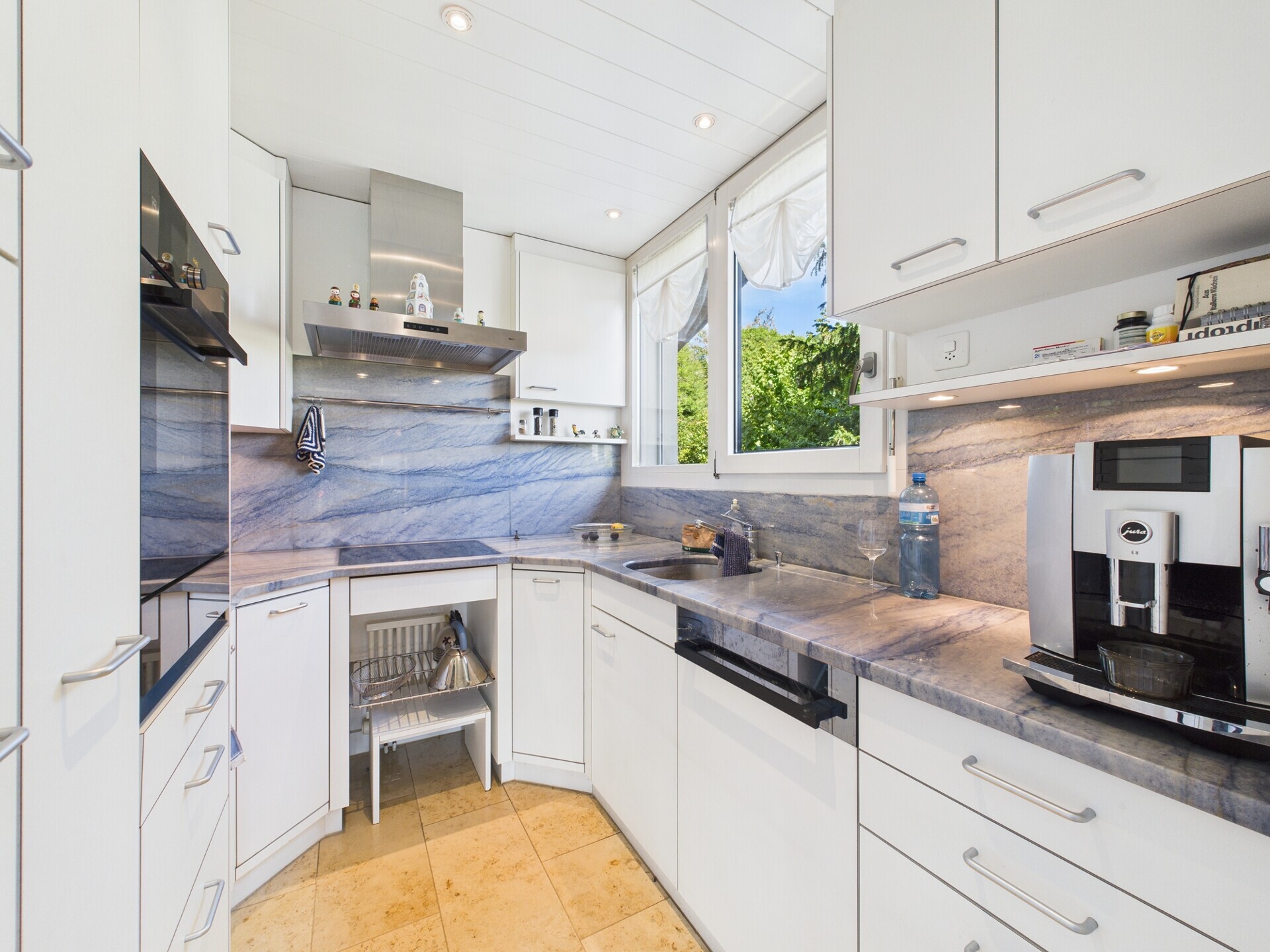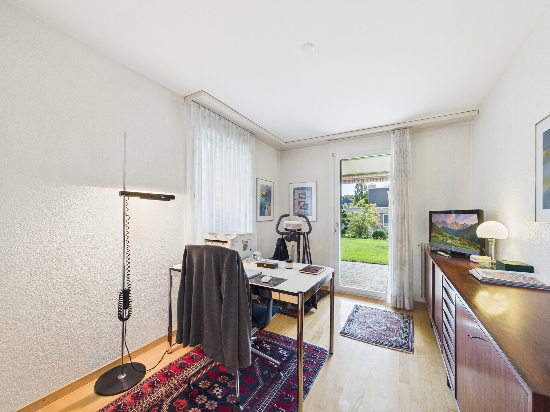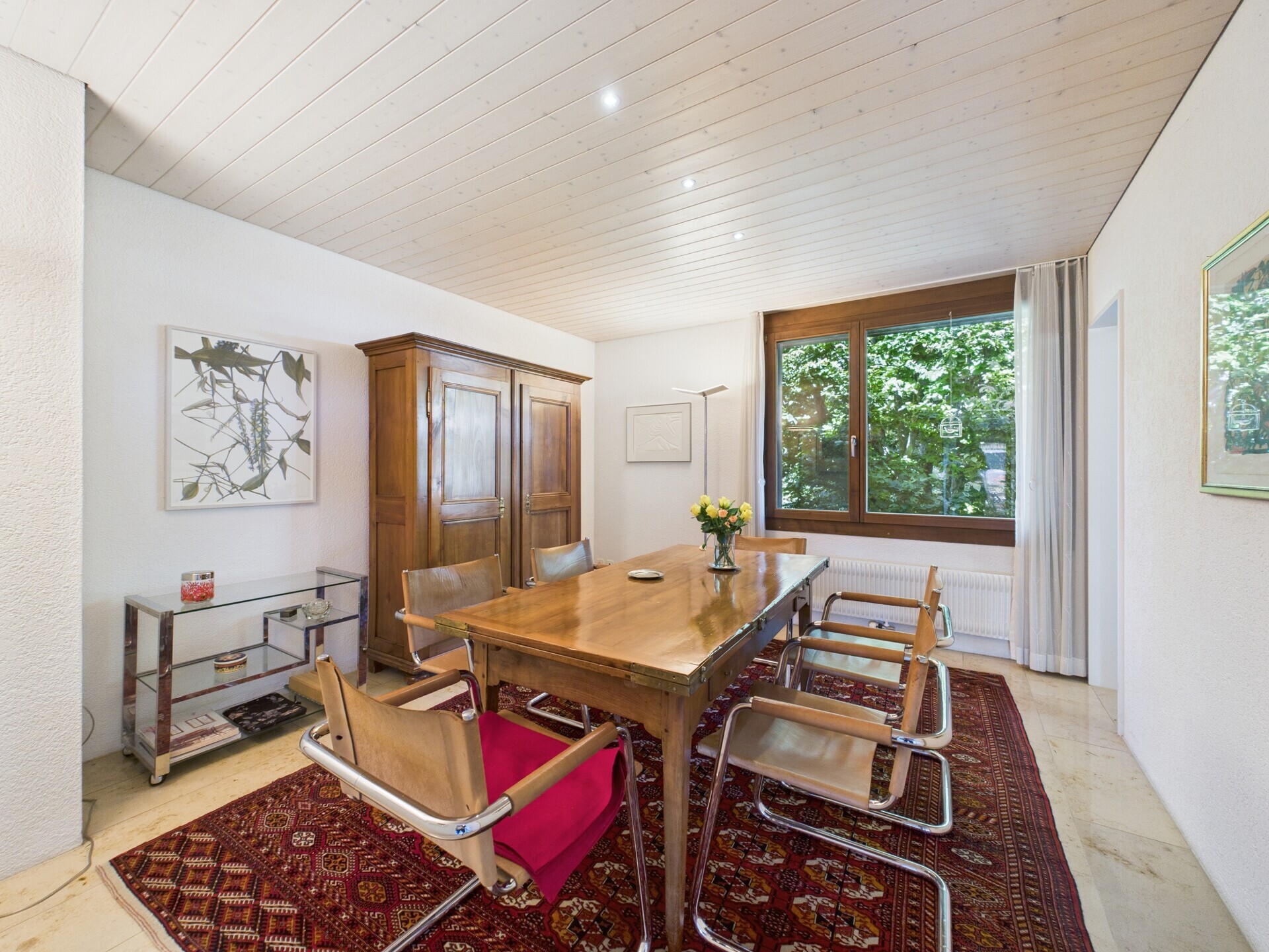 Das Eingangsgeschoss empfängt Sie mit einem freundlichen Entrée mit Garderobe. Zwei helle Zimmer lassen sich vielseitig nutzen, eines davon bietet direkten Zugang in den sonnigen Garten. Ein Bad mit Dusche sowie eine grosszügige Waschküche mit viel Stauraum und Waschbecken runden die Etage ab. Im darunterliegenden Geschoss befinden sich ein klassischer Keller und ein ehemaliger Luftschutzraum, die zusätzlichen Platz schaffen.Das Wohngeschoss im Obergeschoss ist der Mittelpunkt des Hauses. Ein lichtdurchfluteter, offener Wohnbereich mit Cheminée lädt zu gemütlichen Stunden ein. Von hier betreten Sie zwei Balkone, die den Wohnraum nach draussen erweitern. Das angrenzende Zimmer, aktuell als Esszimmer genutzt, verfügt über direkten Zugang zu einem Badezimmer mit Wanne. Die Küche ist abschliessbar, bietet viel Stauraum und erhält durch ihre markante blaue Rückwand eine mediterrane Note. Vom östlichen Balkon gelangen Sie in den hinteren Garten, der mit Rasenflächen, Buchsbüschen und einer einladenden Holzterrasse überzeugt. Hier lässt es sich entspannen und entschleunigen. Edler Jurastein im Wohnbereich und die sorgfältige Materialwahl unterstreichen die Qualität dieses Hauses. Der gepflegte Zustand zeigt, dass es mit Liebe unterhalten wurde. Ein Ort, der Stil und Behaglichkeit verbindet und ein wunderbares Zuhause für die Zukunft bietet.
