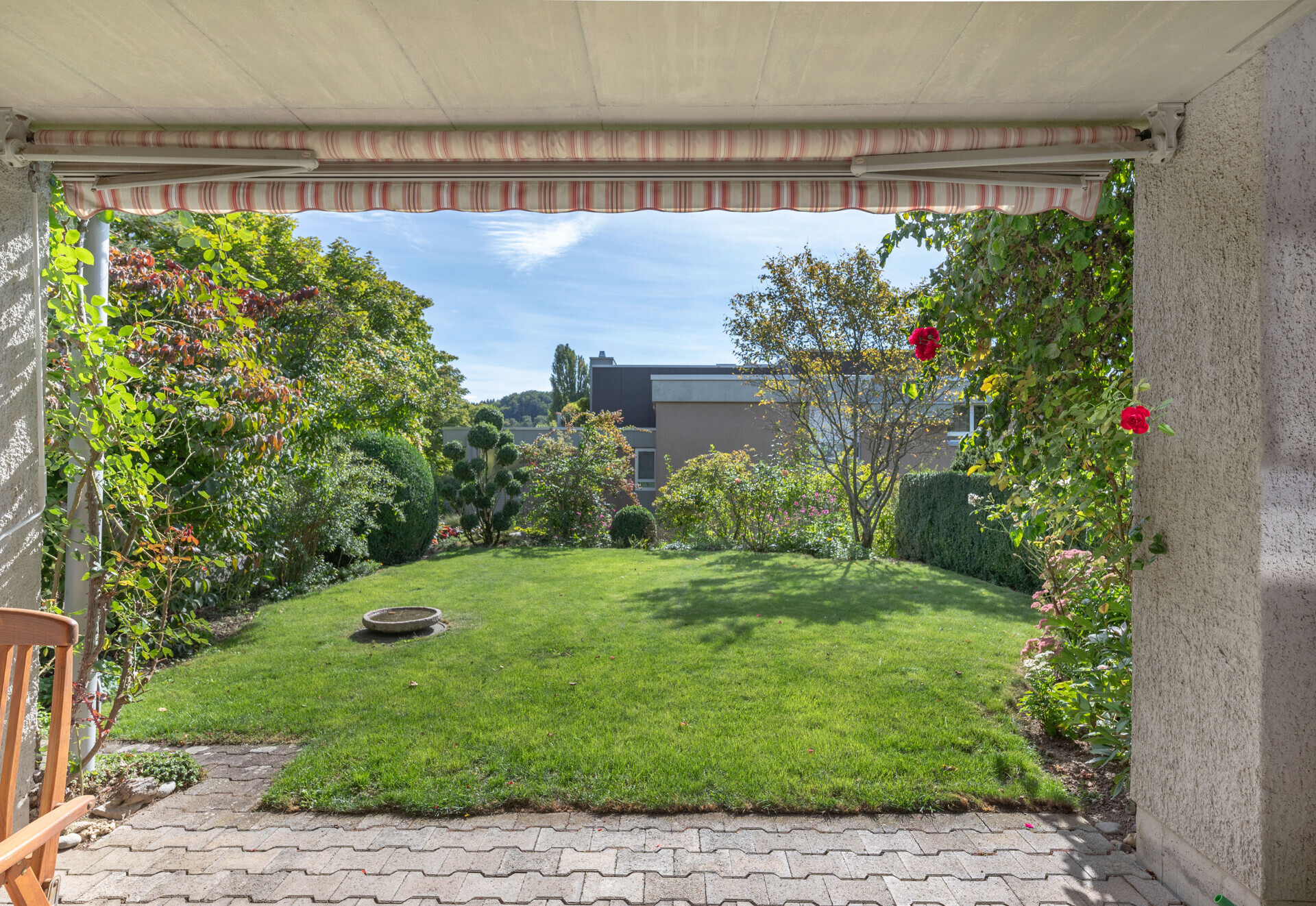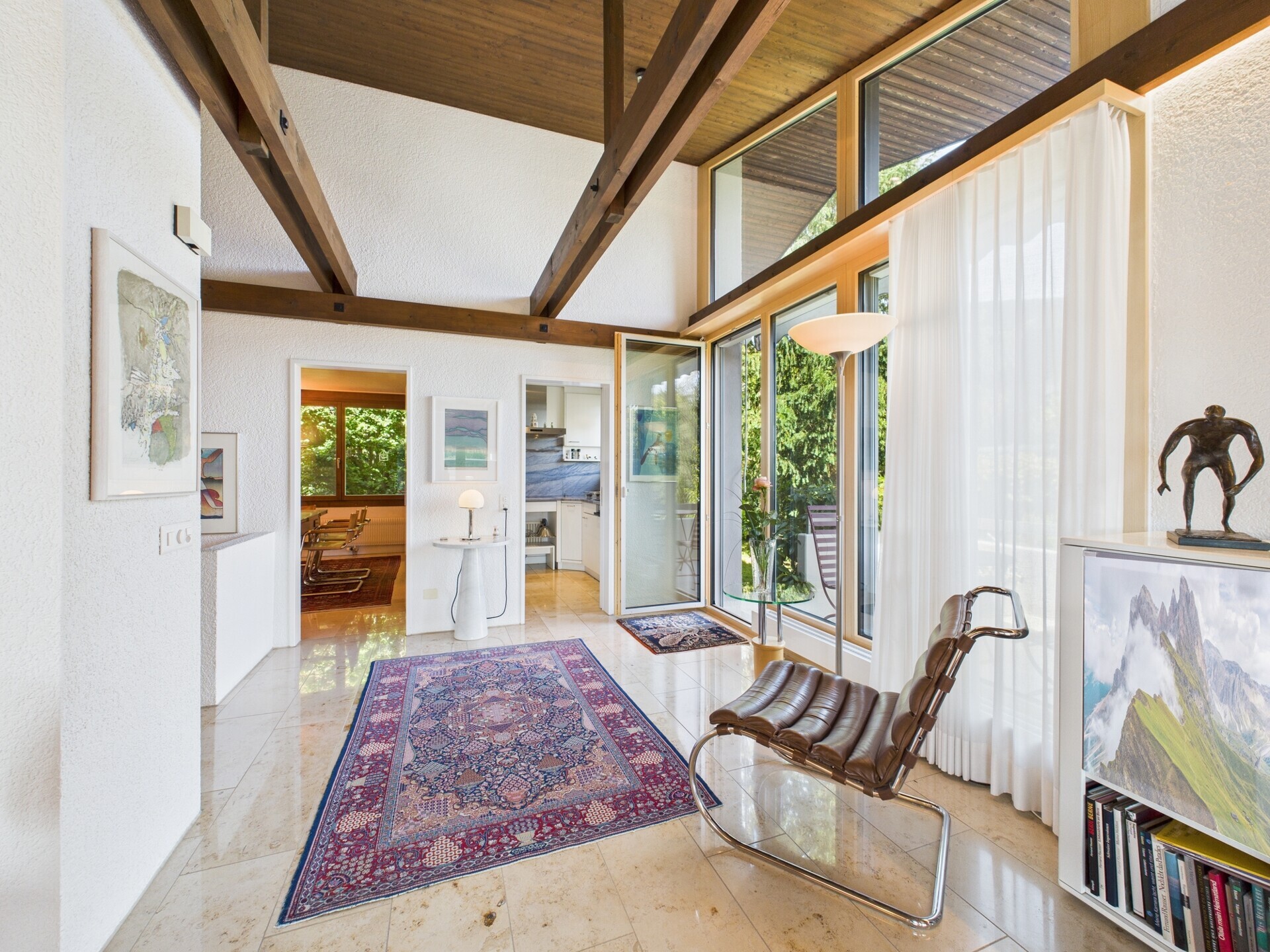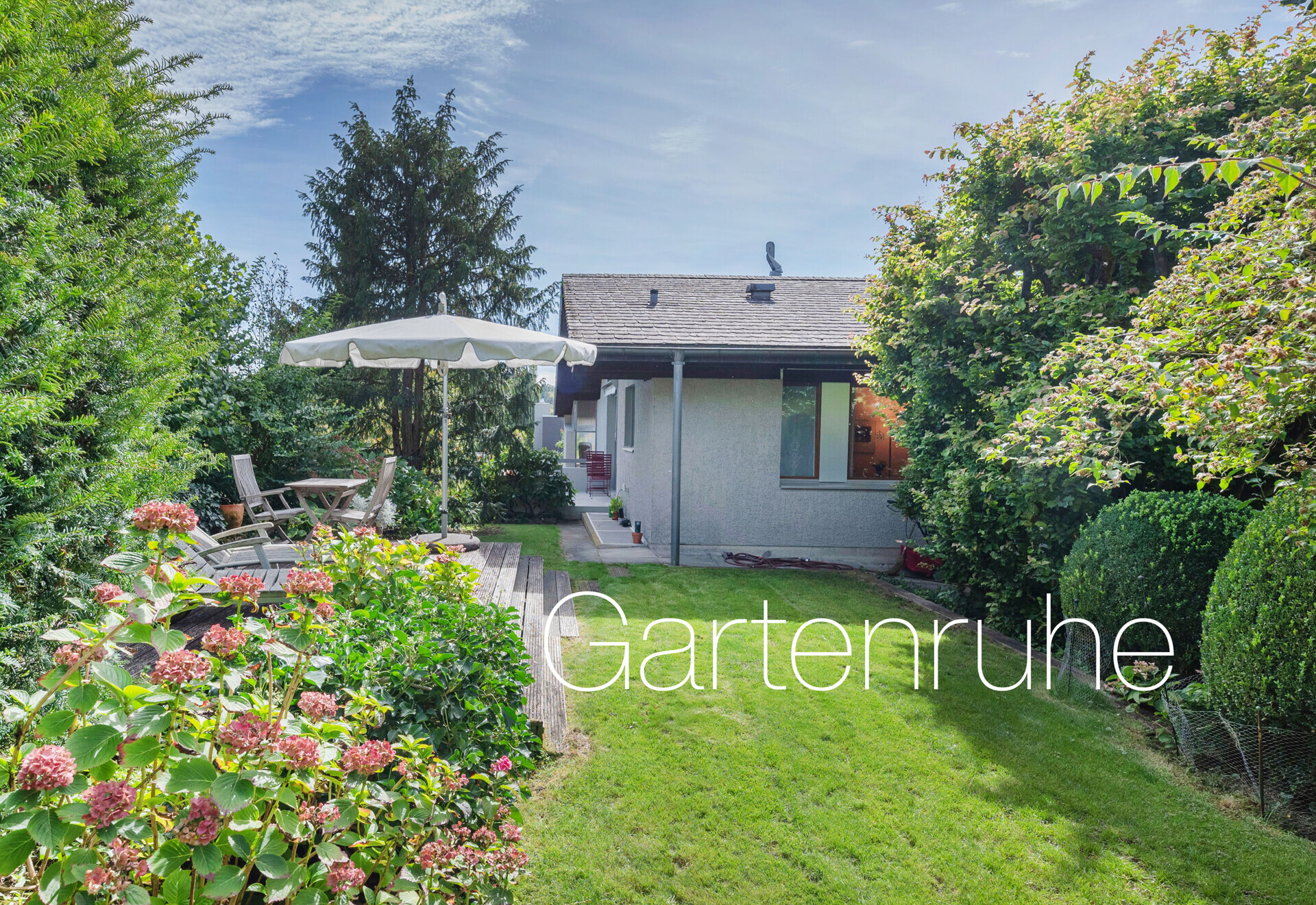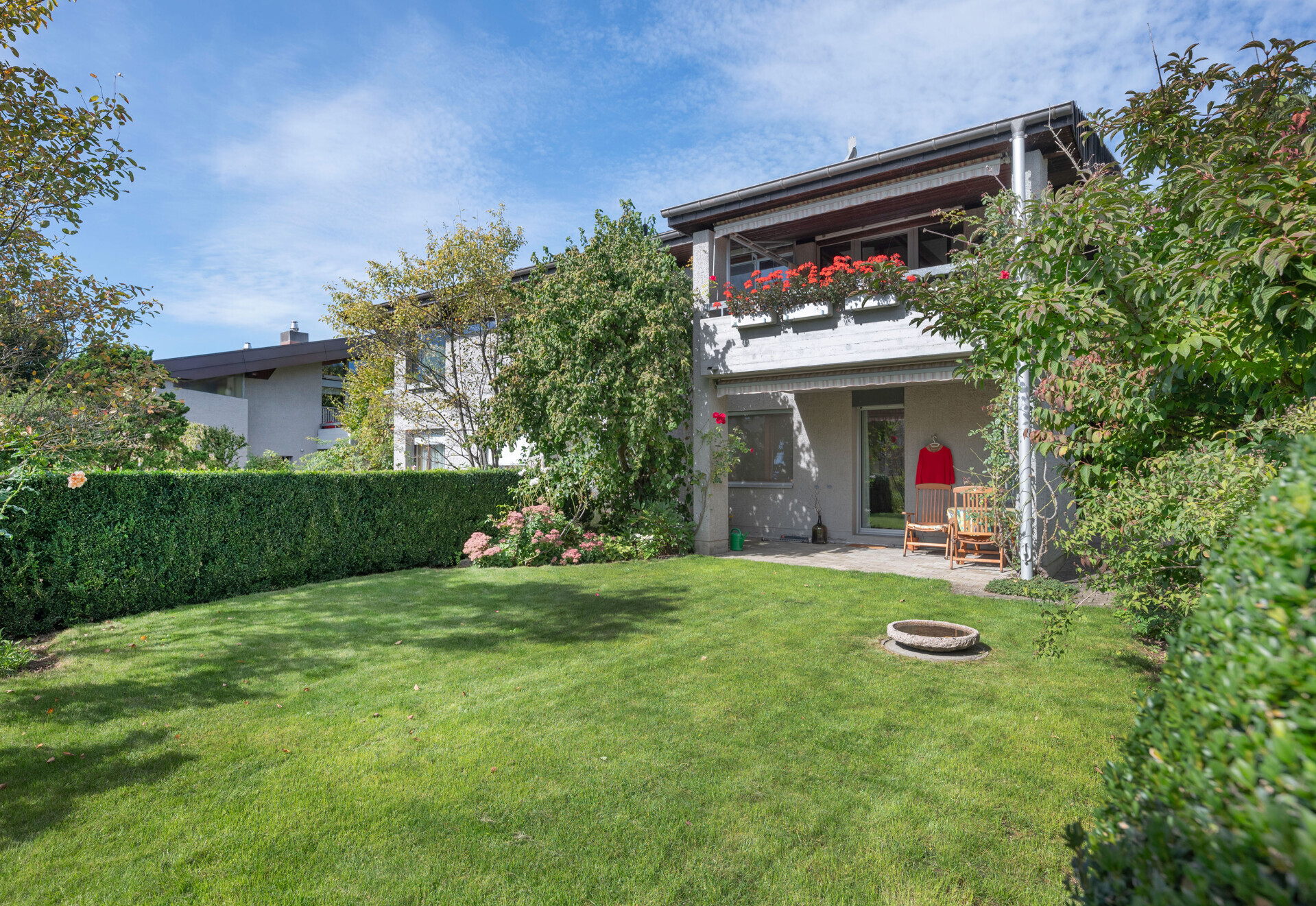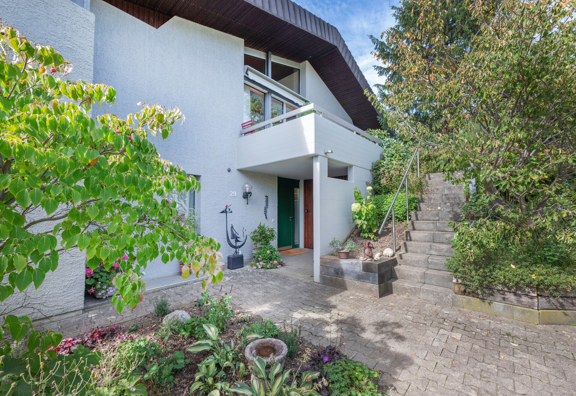 Das Haus wurde harmonisch in den sonnigen Südhang eingebettet. An der Quartierstrasse befinden sich die Garage sowie ein praktischer Raum für Gartengeräte oder Velos. Über eine Treppe gelangen Sie von der Strasse hinauf zum Hauseingang mit vorgelagertem Garten. Dank der Hanglage geniessen Sie Privatsphäre und Ruhe, verbunden mit kurzen Wegen zu Einkaufsmöglichkeiten, Schulen und dem öffentlichen Verkehr.