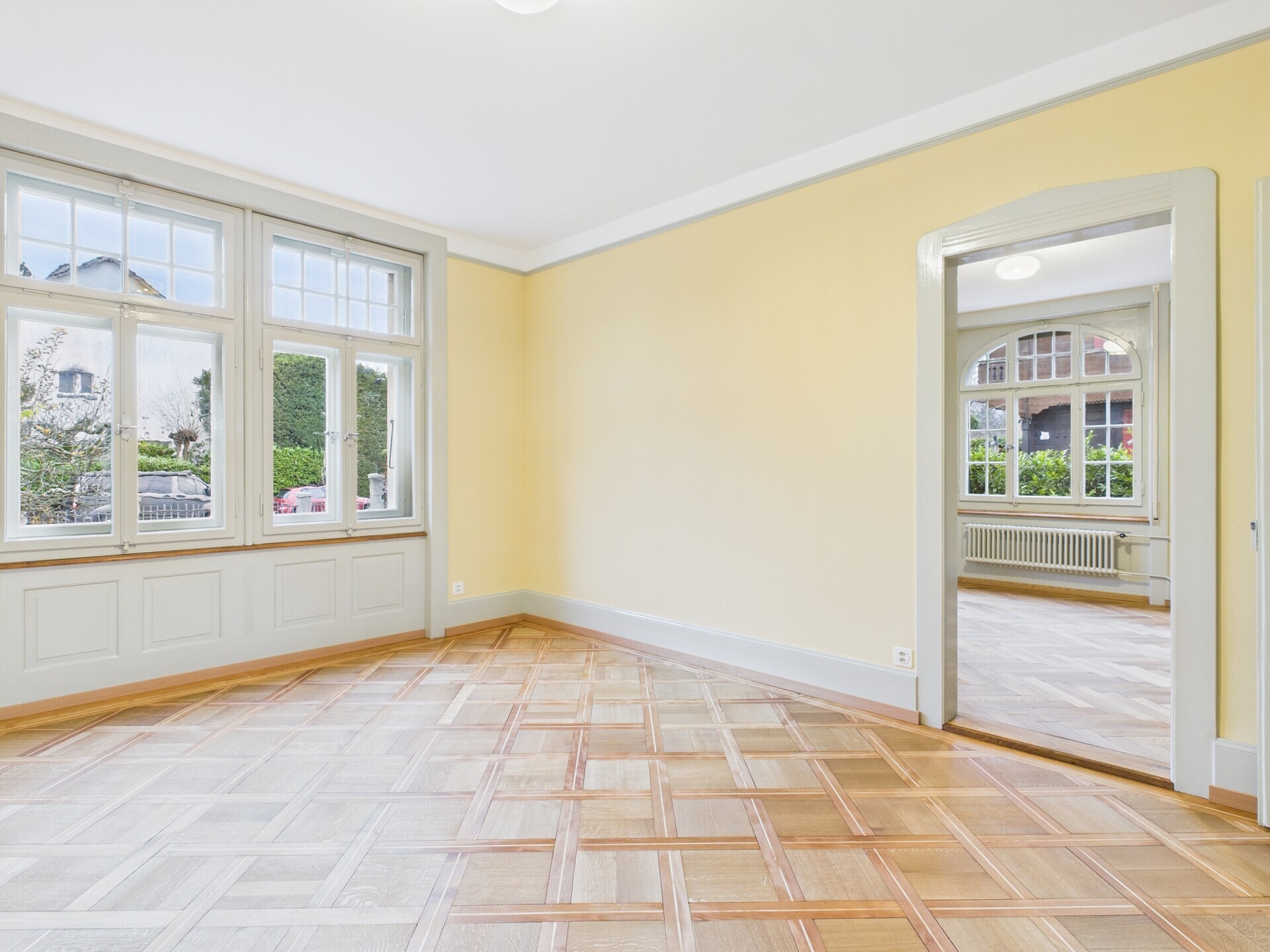 Im Erdgeschoss empfängt Sie ein imposanter Windfang mit anschliessendem Treppenhaus und schönem, erhaltenen Terrazzoboden. Das lichtdurchflutete Wohnzimmer mit einer abschliessbaren Veranda und Zugang in den Garten ermöglicht charaktervolles Wohnen mit einer Raumhöhe von ca. 2.85 m. Das angrenzende Esszimmer verbindet sich mit der Küche, die in Materialität und Gestaltung den hohen Anspruch der Sanierung unterstreicht. Ein modernes Bad mit Dusche ergänzt diese Ebene.Im Obergeschoss befinden sich drei abgeschlossene Zimmer. Sie verfügen teilweise über Einbauschränke und individuelle Farbwelten, was eine Atmosphäre von Klarheit und Behaglichkeit schafft. Von hier aus haben Sie Zugang zum Balkon, der zu Momenten der Entspannung einlädt. Ein helles Badezimmer mit Badewanne rundet diese Etage ab.