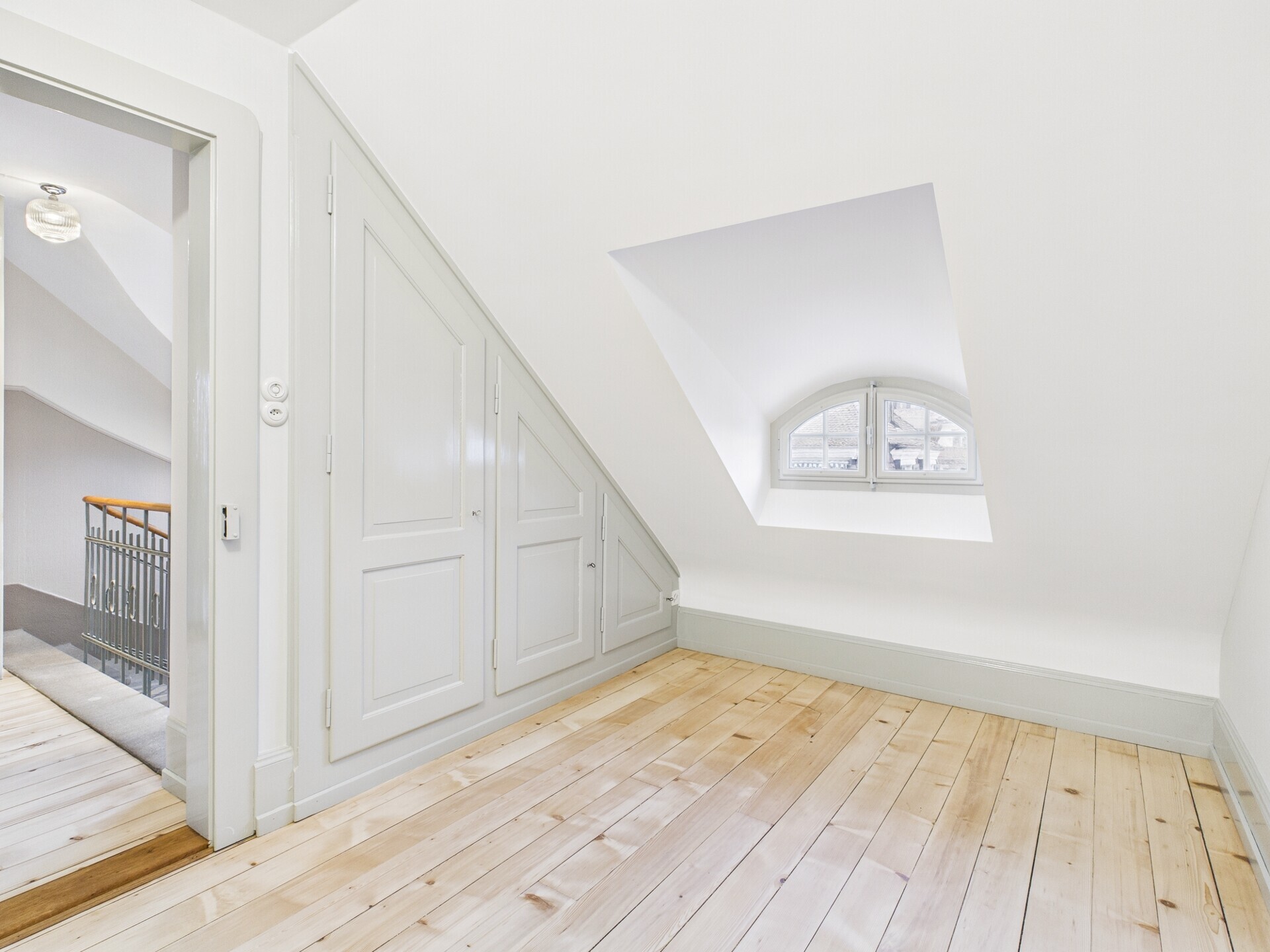 Das Dachgeschoss bietet drei weitere Zimmer mit Einbauschränken und kunstvollen Dachformen. Eine zusätzliche Toilette sorgt für Komfort. Eine ausziehbare Treppe führt zum Estrich, der praktischen Stauraum bietet.