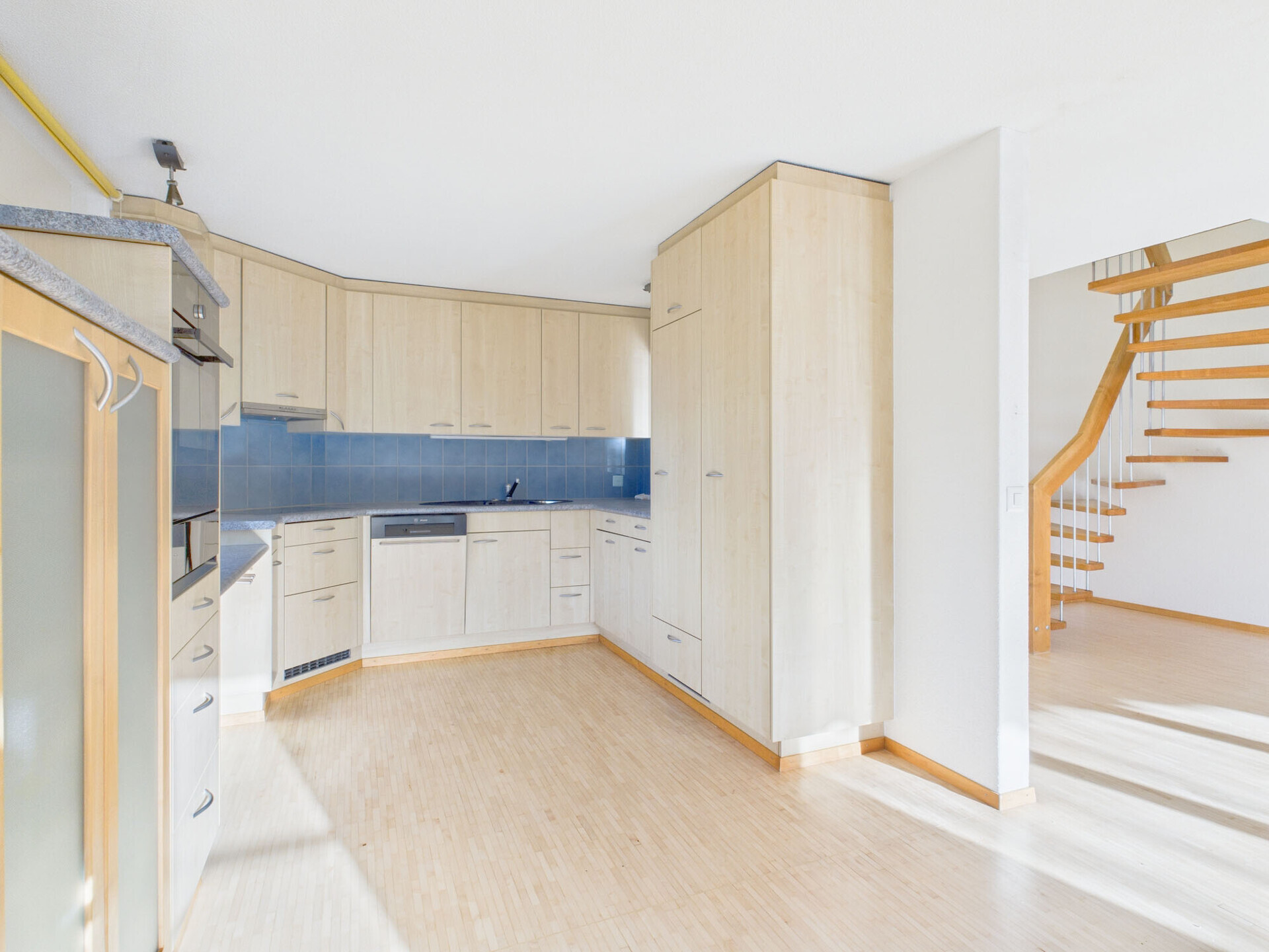 Bereits beim Eintreten empfängt Sie ein einladender Eingangsbereich. Auf der ersten Wohnebene befindet sich die halboffen gestaltete Küche, ausgestattet mit Backofen und Steamer (Geräte weniger als vier Jahre alt). Der offen konzipierte Wohn- und Essbereich bildet das Herzstück der Wohnung und schafft mit dem gemütlichen Schwedenofen eine warme Wohnatmosphäre. Von hier gelangen Sie auf den gedeckten Balkon mit Blick ins Dorf. Ergänzt wird diese Ebene durch ein Büro beziehungsweise Gästezimmer sowie ein Gäste-WC.Im 2. Obergeschoss stehen drei geräumige Schlafzimmer zur Verfügung. Ein grosszügiges Badezimmer mit Waschmaschine und Tumbler auf fast 16 m² sorgt für hohen Wohnkomfort. Der Vorplatz verbindet die Räume harmonisch miteinander - ein Zimmer verfügt über Zugang zu einem weiteren Balkon.