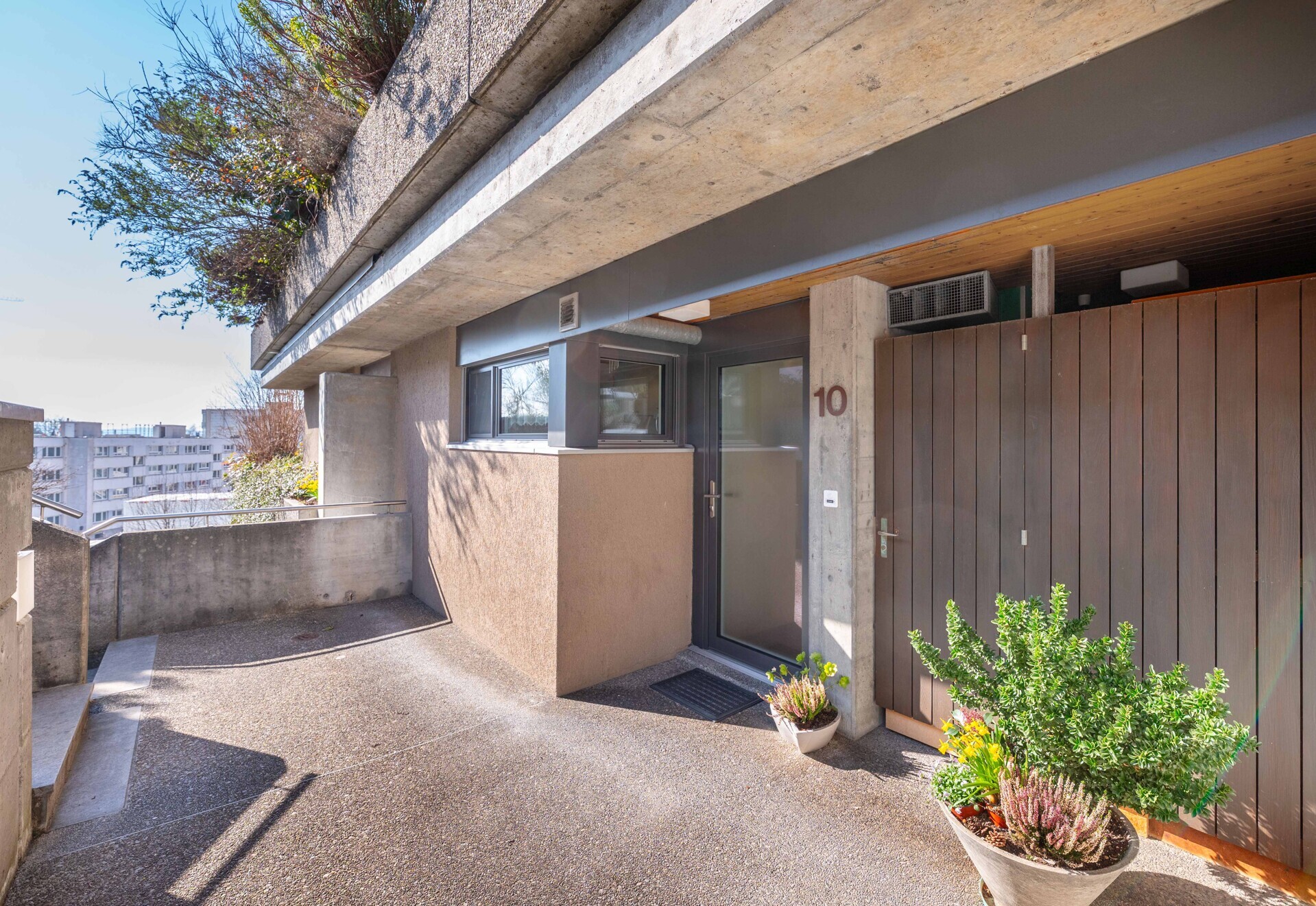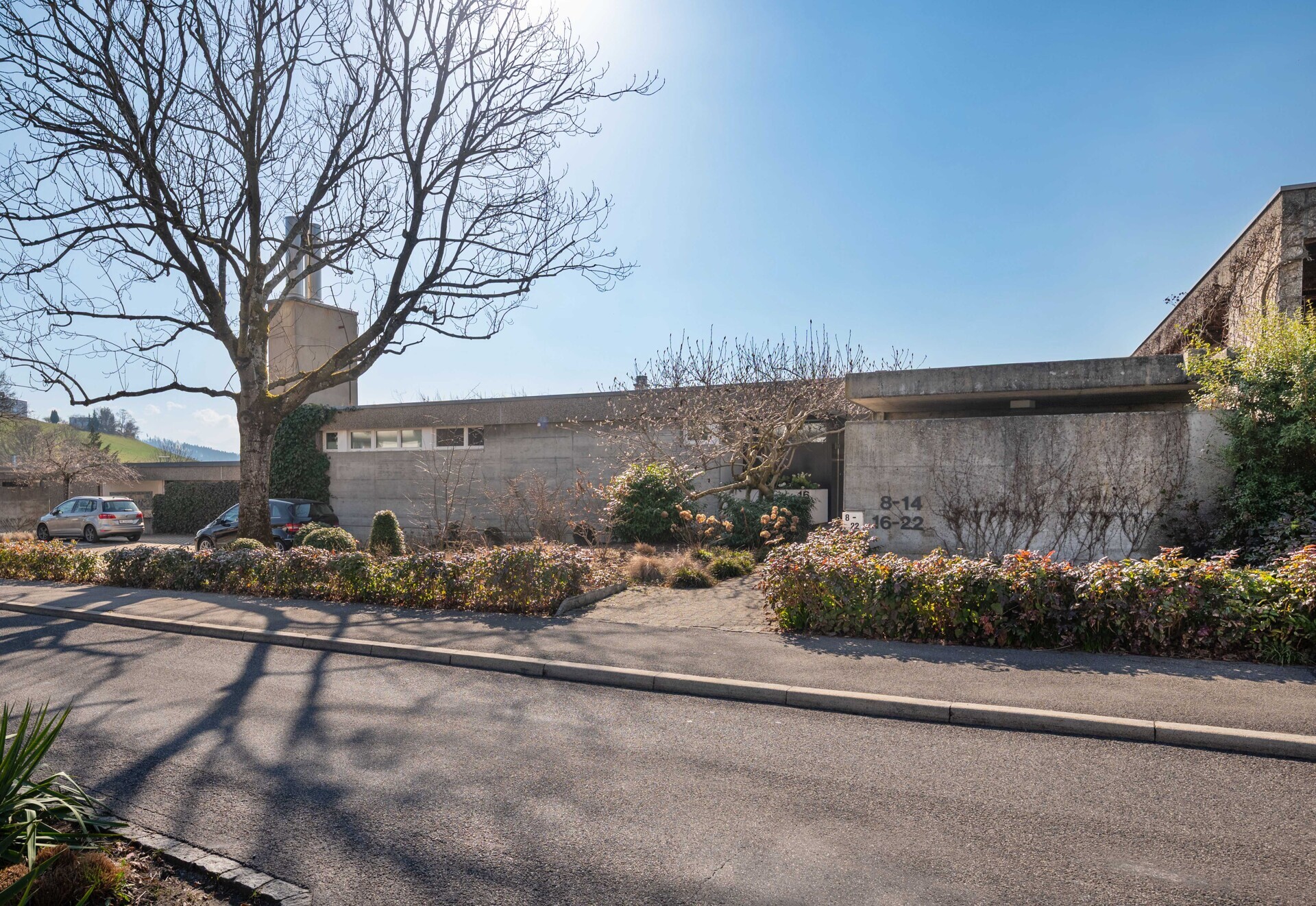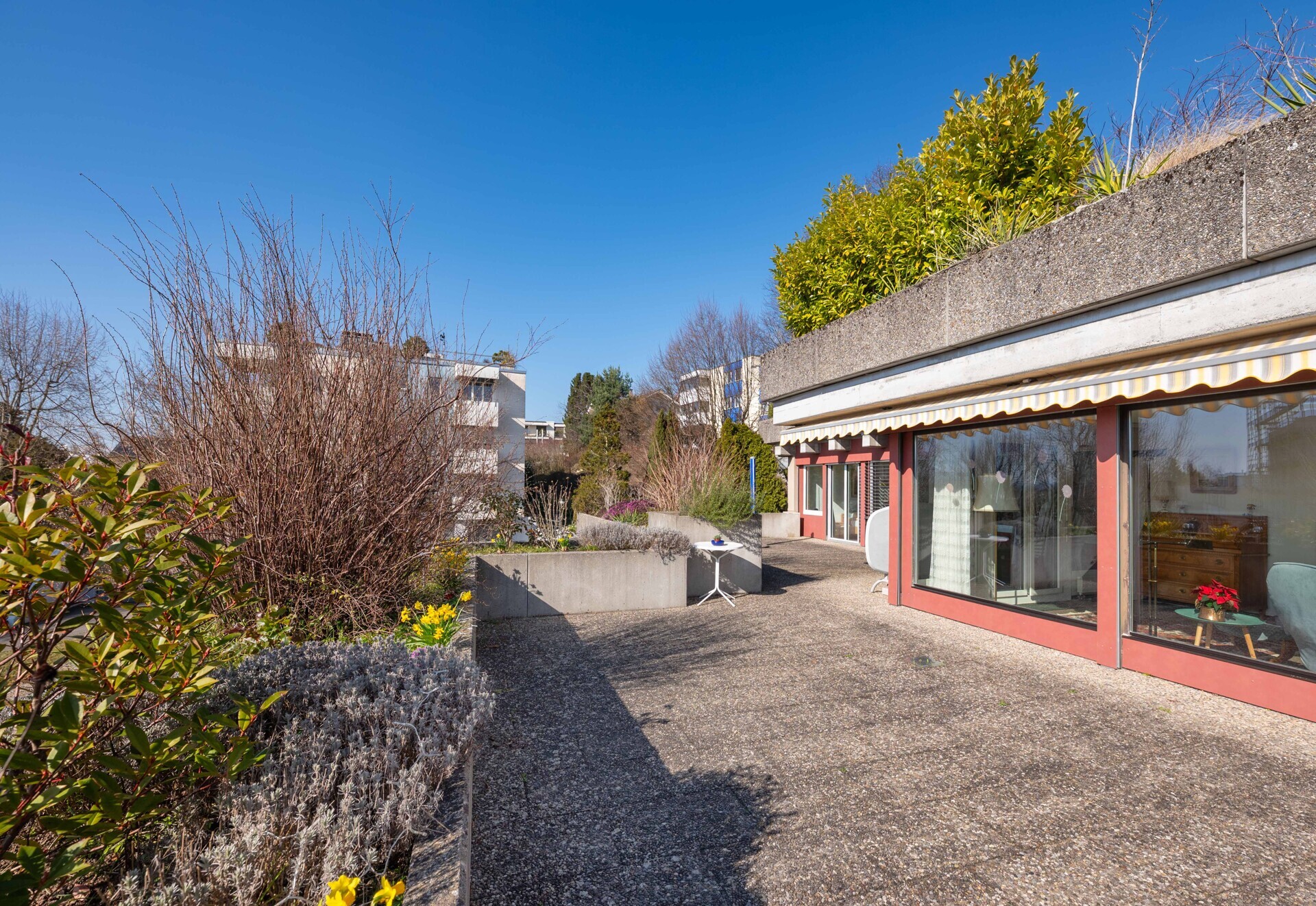 Das Terrassenhaus präsentiert sich harmonisch eingebettet an sehr beliebter Hanglage in einem ruhigen und kinderfreundlichen Quartier mit hoher Wohnqualität. Die Siedlung mit viel Grün- und Erholungsflächen umfasst 47 Terrassenhäuser, eine zentrale Heizungsanlage, eine Einstellhalle mit 64 Einstellplätzen und Autowaschanlage, Aussenparkplätze sowie verschiedene Nebenräume. Der Kinderspielplatz, wie auch die Grünflächen dürfen von den Bewohnern der benachbarten Überbauung genutzt werden.