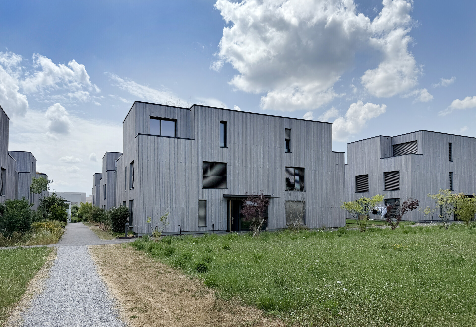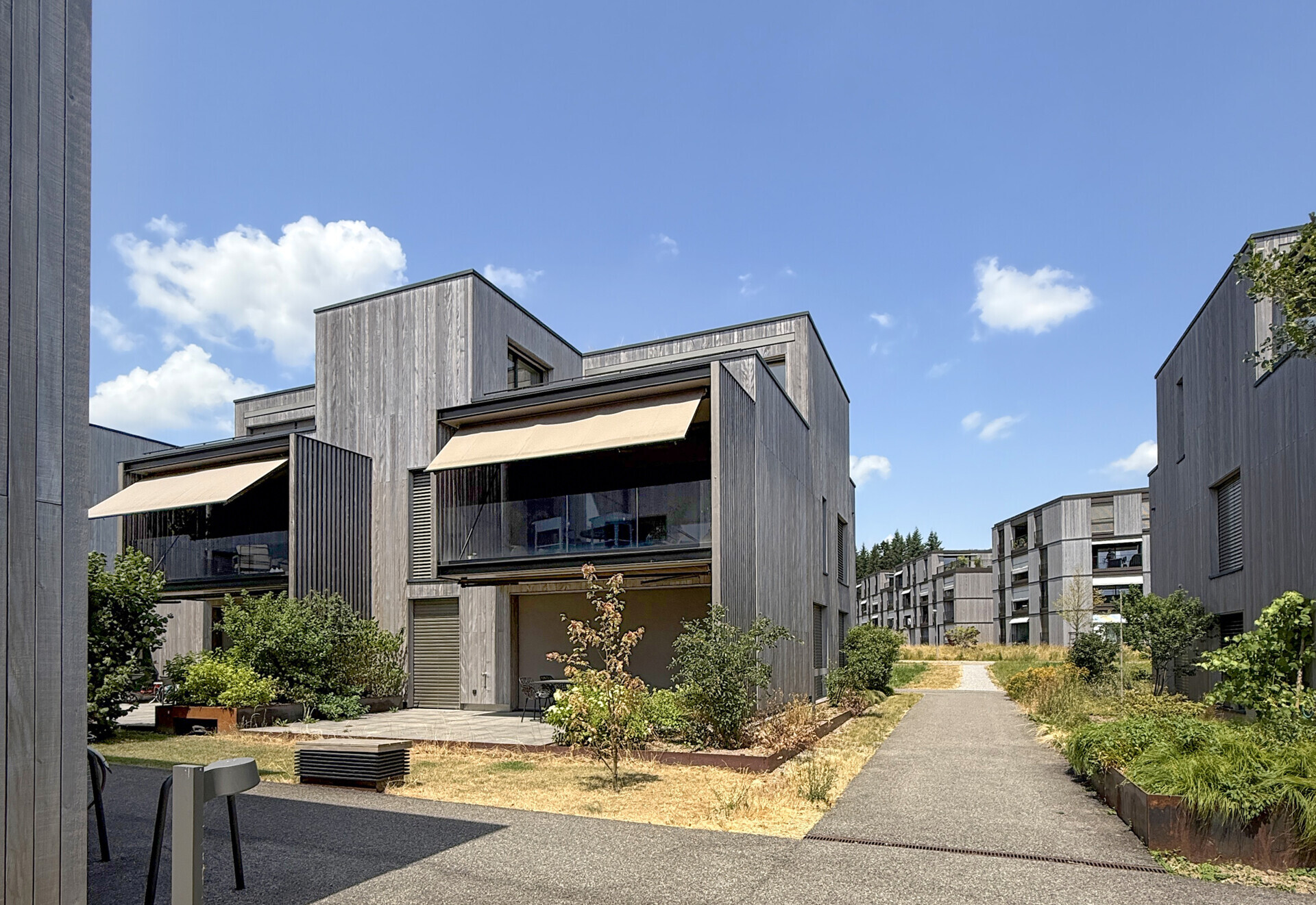Die Überbauung ist Teil des Schäferei-Areals. Die Häuser präsentieren sich in klarer, kubischer Formensprache moderner Architektur. Massivbauweise und eine hinterlüftete Holzfassade schaffen ein nachhaltiges, warmes Erscheinungsbild.