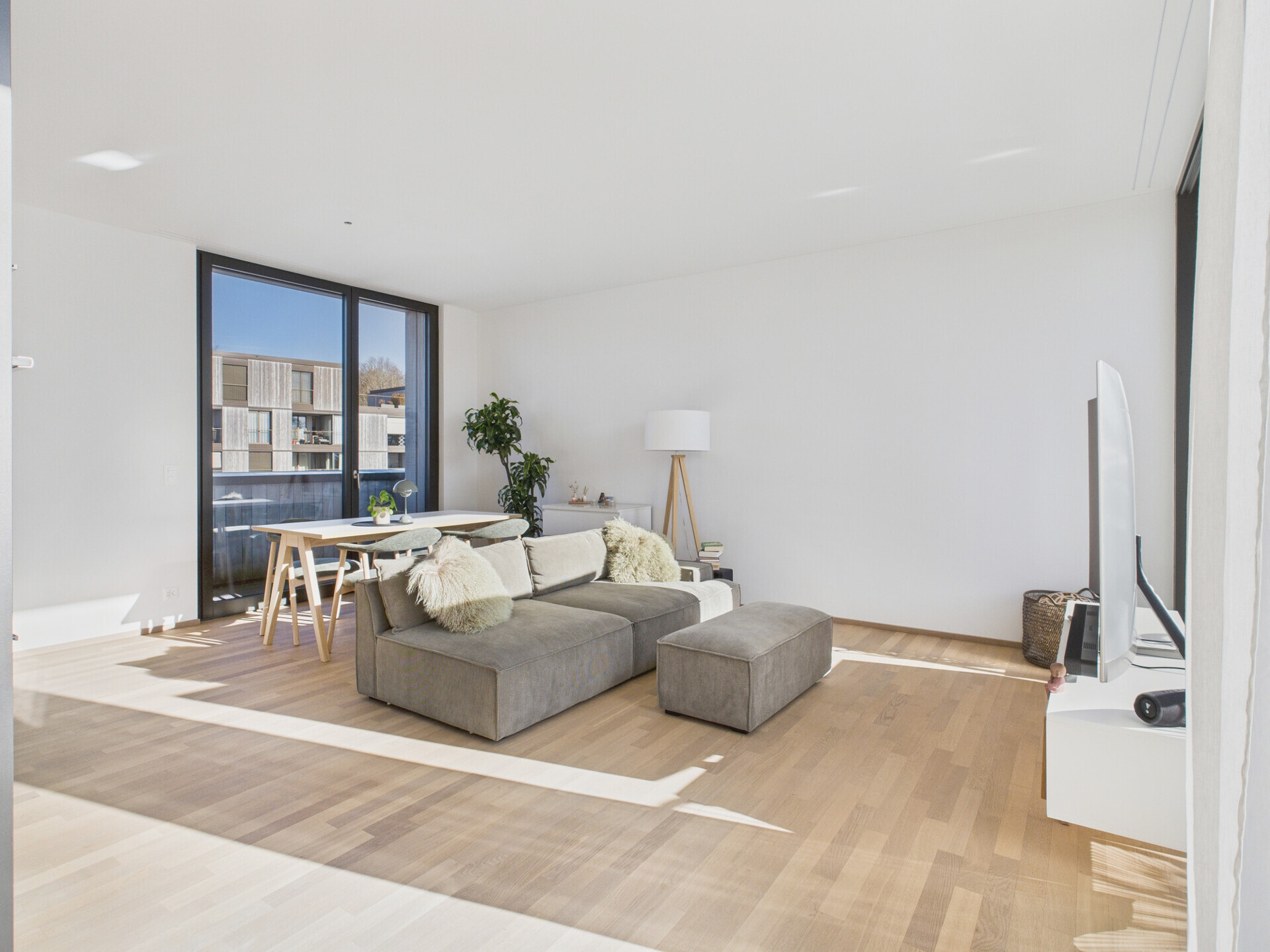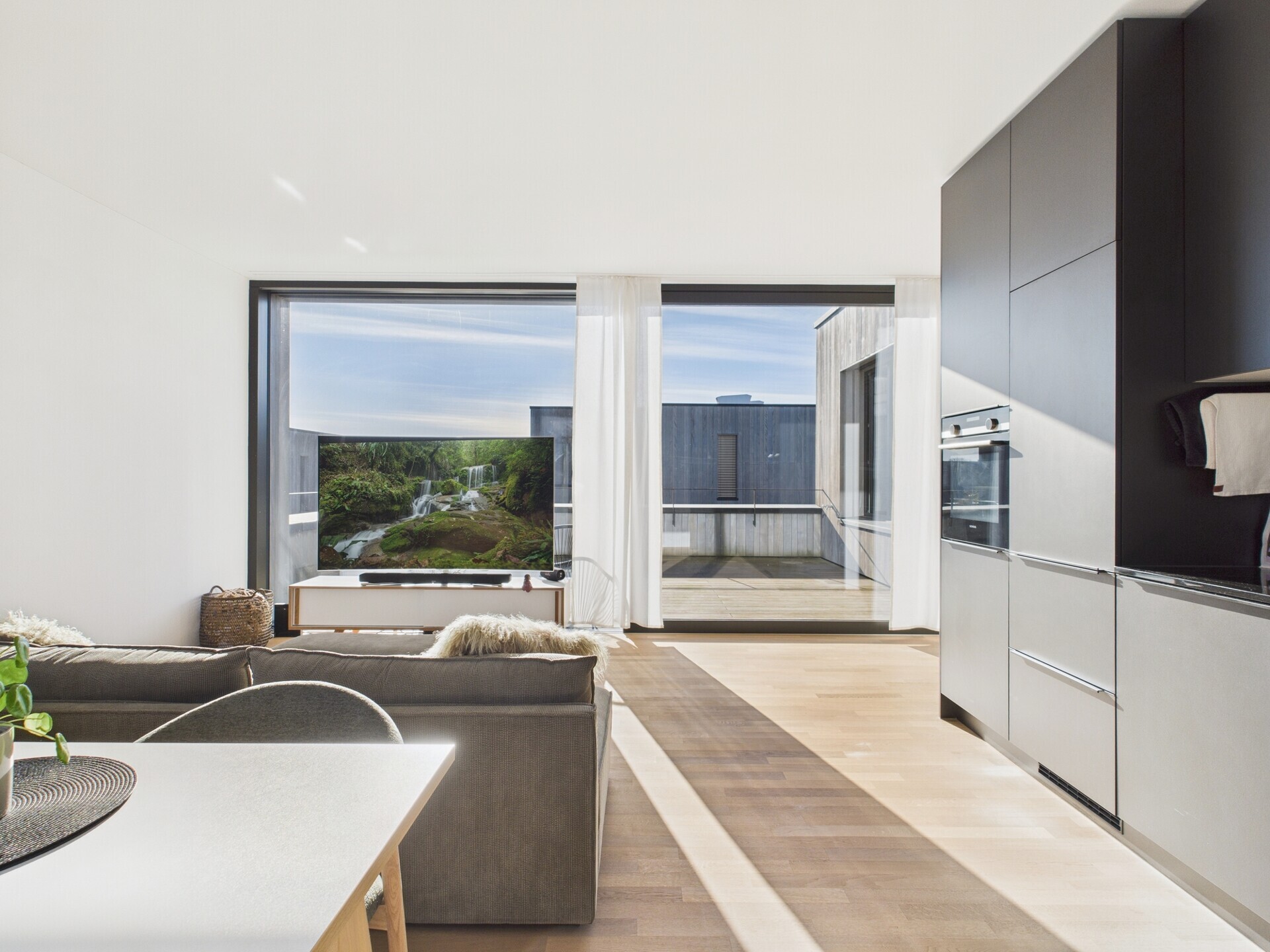 Der helle Holzboden harmoniert stilvoll mit den schwarzen Fensterrähmen und der modernen, mattschwarzen Küche. Die Küche bietet Stauraum bis zur Decke, Geschirrspüler, Induktionskochfeld, Backofen und grossen Kühlschrank. Ein angrenzendes Réduit eignet sich ideal für Haushaltsgeräte und zusätzlichen Stauraum.
