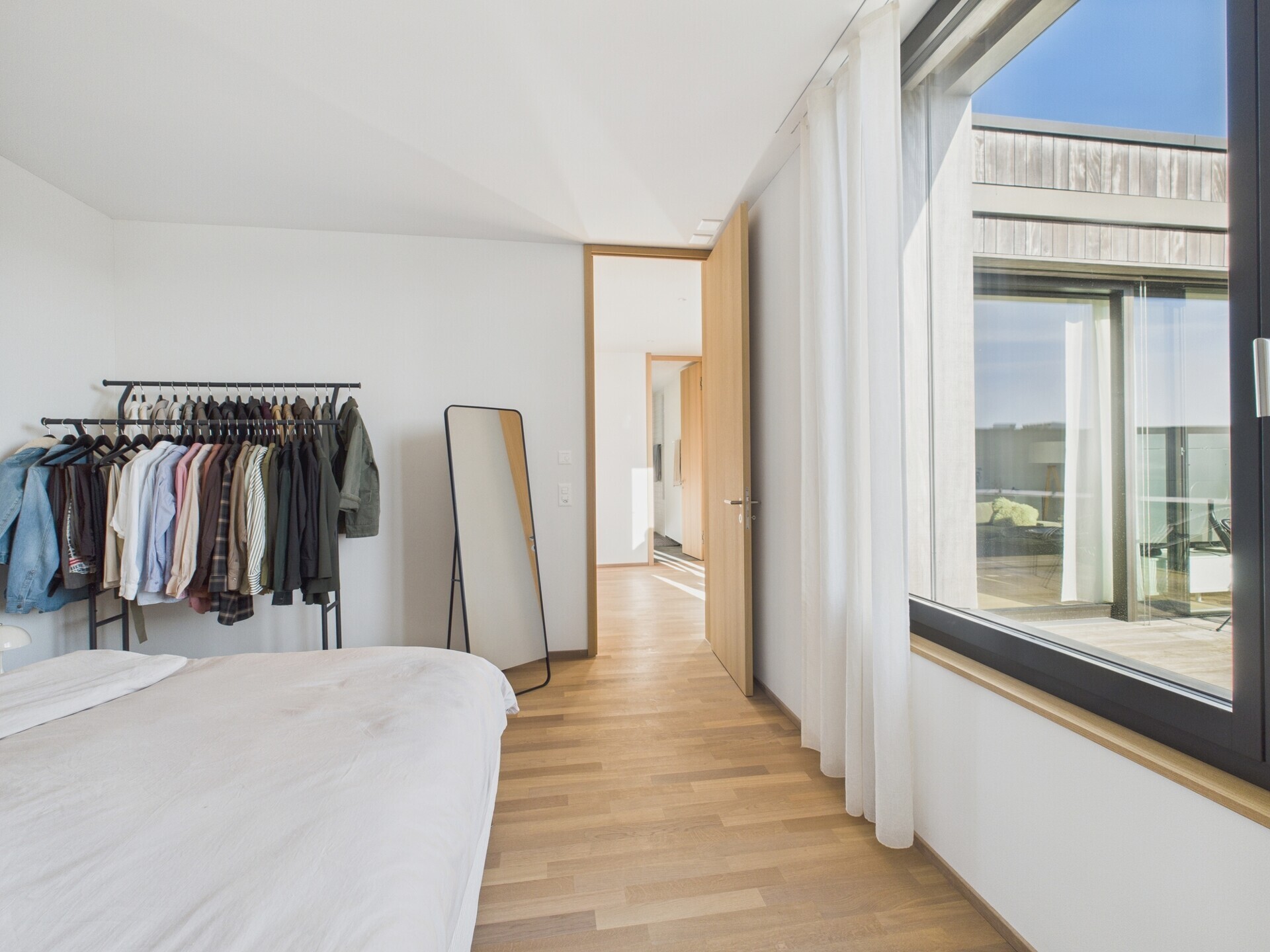 Das geräumige Schlafzimmer (16,3 m²) verfügt über ein grosses Fenster mit Blick zur Terrasse.
