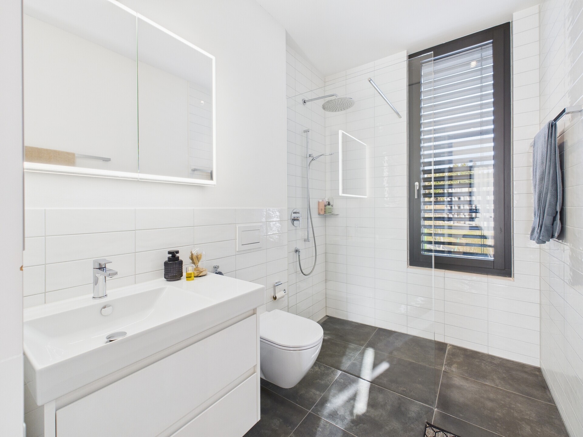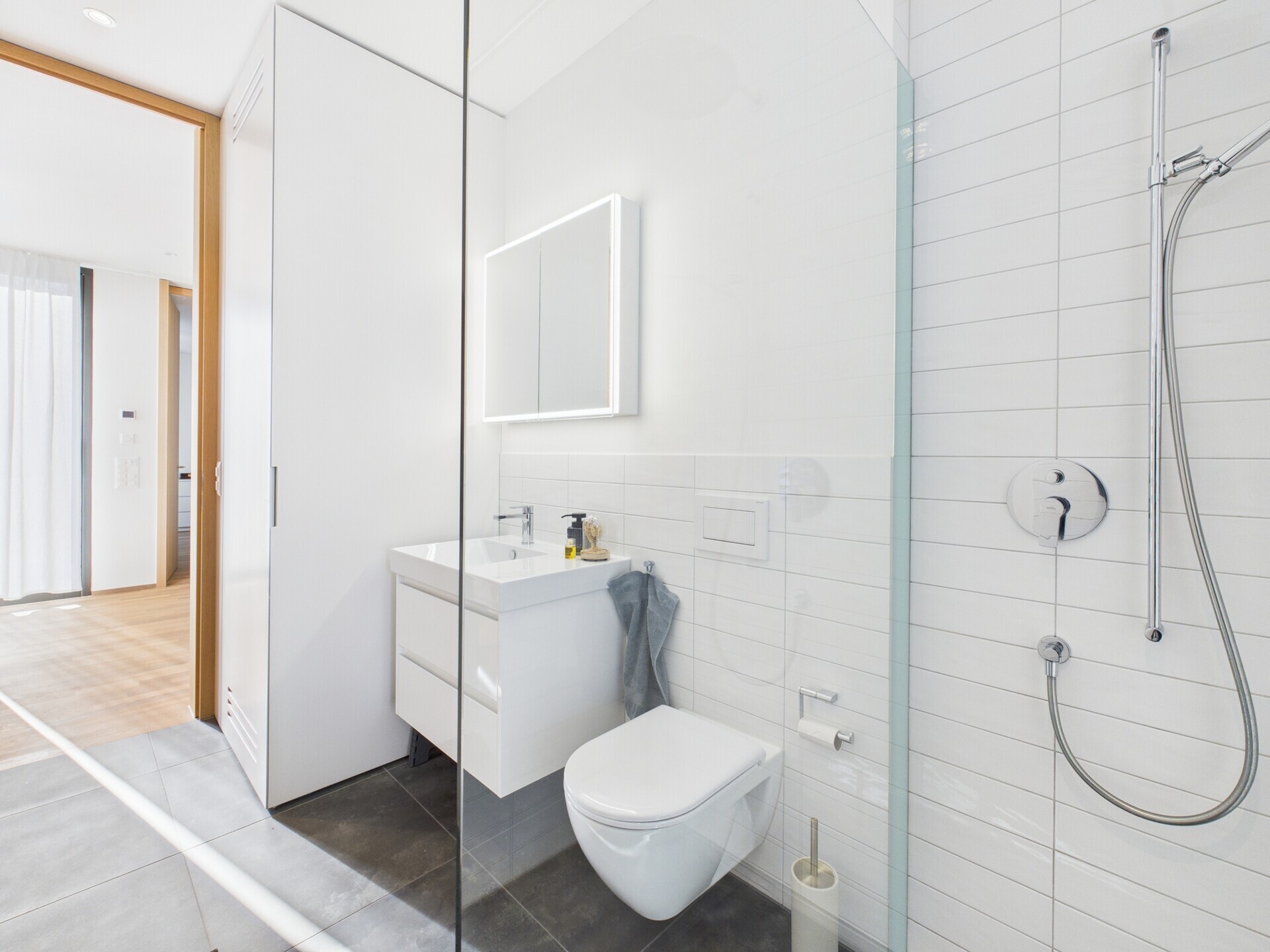 Das Badezimmer überzeugt mit bodenebener Dusche, elegantem Steinboden, viel Stauraum im Spiegelschrank, Unterschrank und einem weiteren Einbauschrank mit Waschmaschine und Tumbler. Auch der Eingangsbereich ist mit einer integrierten Garderobe und viel Stauraum optimal genutzt.